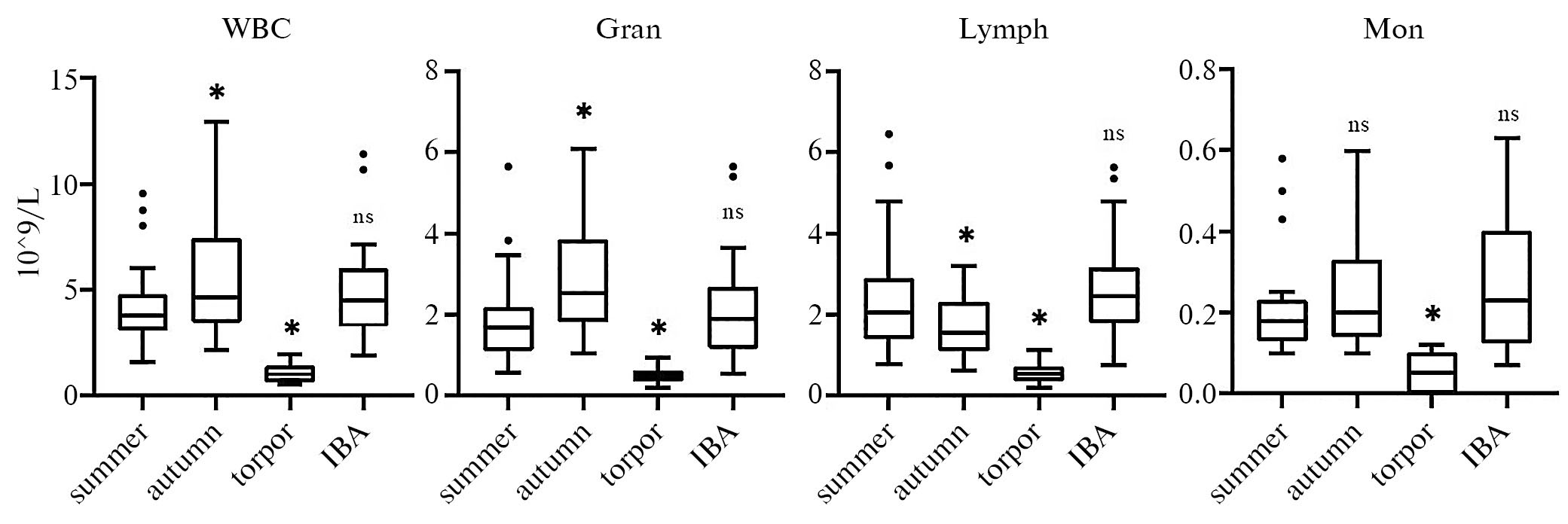 Рис. 3. Сезонные изменения лейкоцитарного пула в периферической крови сусликов U. undulatus (n = 25 для каждого времени года). Значения представлены в виде диаграммы размаха (box plot), где ● – выбросы, * – статистически значимые различия с группой “лето” (p <0.05, здесь и далее U-критерий Манна – Уитни), ns – по результатам статистической проверки достоверных отличий не обнаружено (р ≥0.05). WBC – лейкоциты; Mon – моноциты; Lymph – лимфоциты; Gran – гранулоциты (суммарно нейтрофилы, базофилы и эозинофилы).