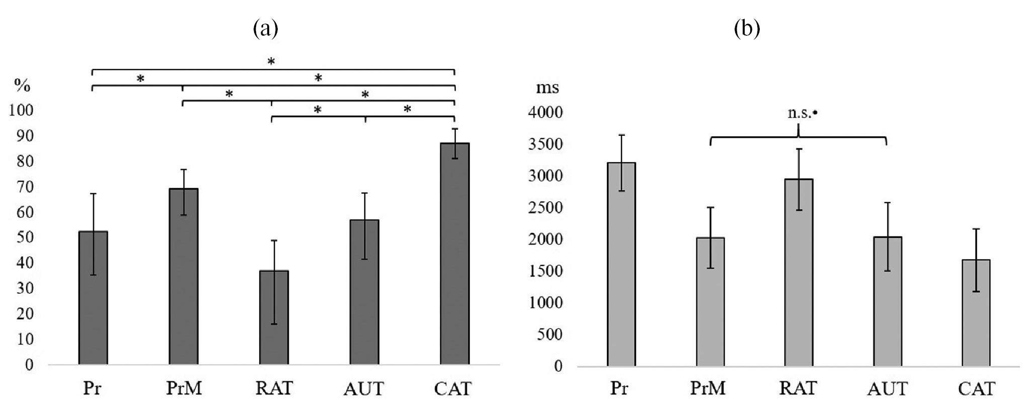 По оси X – задания: Pr – придумать оригинальное окончание пословицы, меняющее ее смысл; PrM – назвать общеизвестное окончание пословицы; RAT – найти слово, употребимое с каждым из трех предъявленных; AUT – придумать оригинальные способы употребления обычных предметов; CAT – перечислить объекты из категорий. По оси Y – процент ответов, % (a), время ответа, мс (b). На рис. (a) – количество ответов (%) медианы и 2–3 квартили, скобки обозначают различия между заданиями (p<0.05). На рис. (b) – время ответа (мс), среднее и стандартное отклонение. Время ответа во всех заданиях отличается друг от друга, за исключением обозначенного (n. s.•) сравнения (PrM vs AUT).