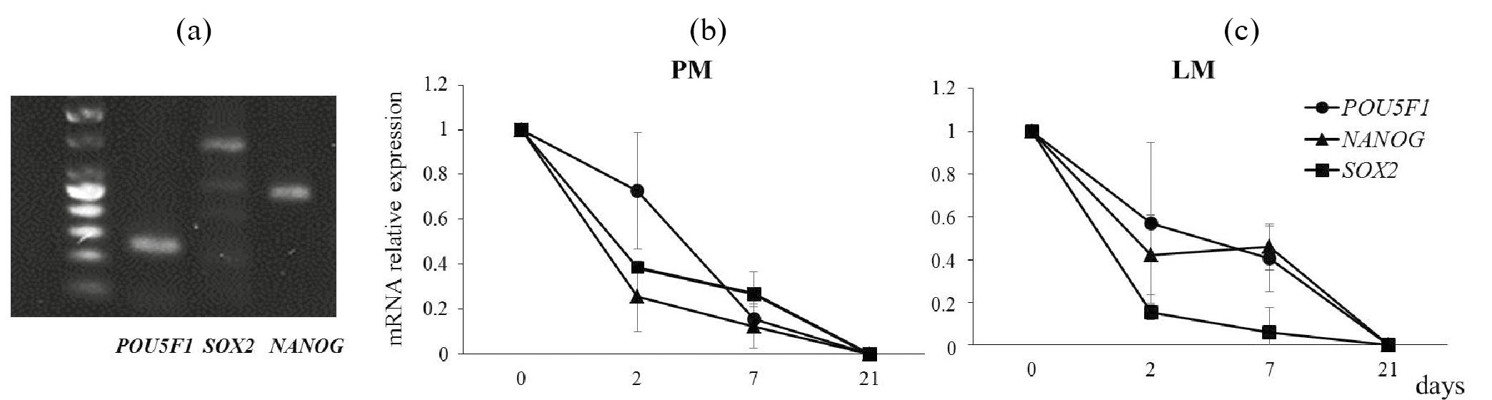 Рис. 2. Экспрессия маркеров плюрипотентности при дифференцировке ИПСК в мезодермальном направлении. (a) – Экспрессия генов POU5F1, SOX2, NANOG в исходной культуре ИПСК. Электрофореграмма продуктов ПЦР. Изменение экспрессии маркеров плюрипотентности в ИПСК в процессе дифференцировки в параксиальную мезодерму (b) и латеральную мезодерму (c). Представлены средние величины и их ошибки 3-х независимых экспериментов. PM – параксиальная мезодерма. LM – латеральная мезодерма.