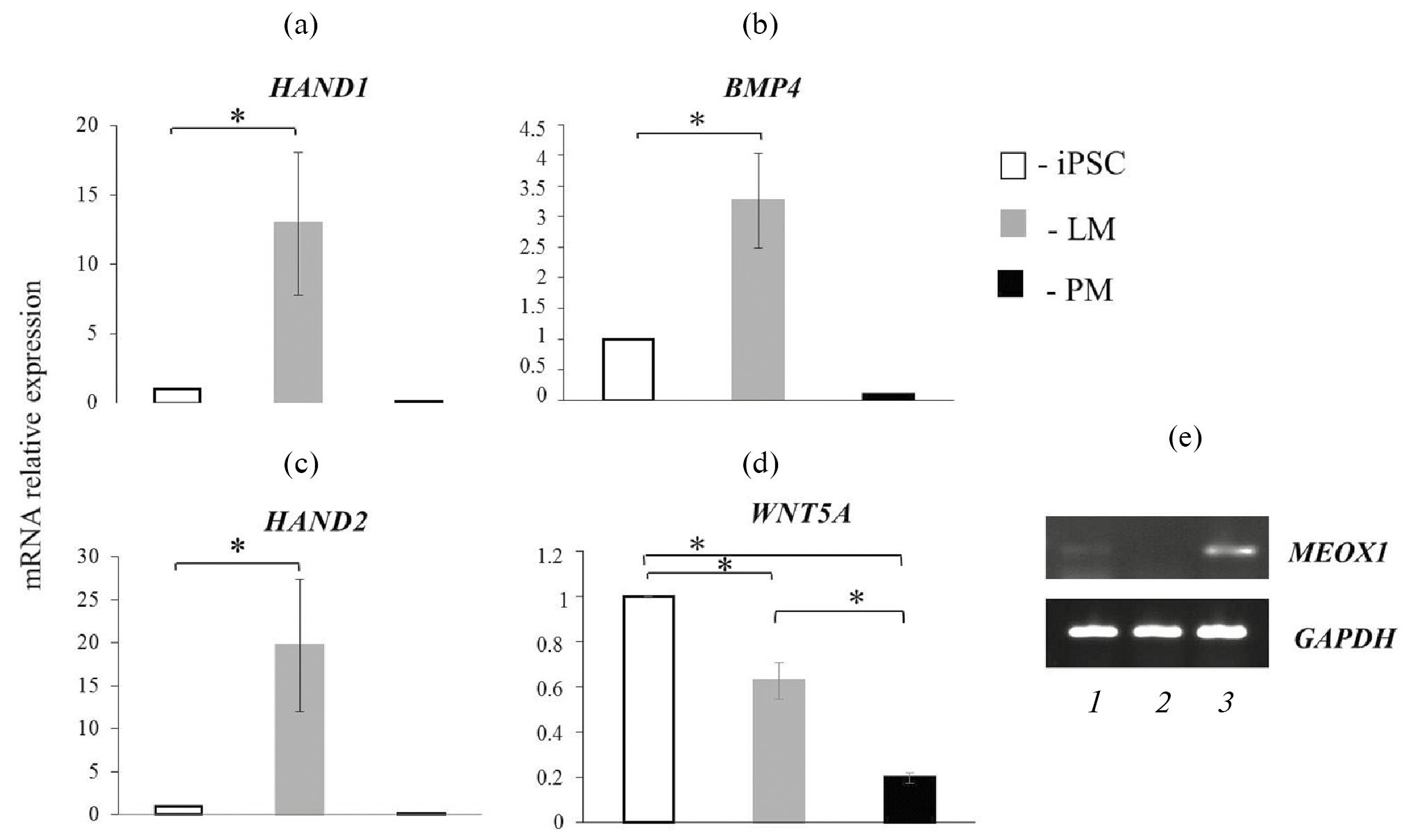 Рис. 5. Относительная экспрессия генов в клетках ПМ и ЛМ, дифференцированных из ИПСК. Уровень экспрессии генов HAND1 (а), HAND2 (b), BMP4 (c) и WNT5A (d) на 7-й день дифференцировки относительно исходной культуры ИПСК. Представлены средние величины и их ошибки 3 независимых экспериментов. Звездочка показывает достоверность различий при p < 0.05. (e) – экспрессия гена пресомитной мезодермы MEOX1 в клетках при специфической многостадийной и неспецифической одностадийной дифференцировке ИПСК в мезодермальном направлении на 7-й день культивирования. iPSC – индуцированные плюрипотентные стволовые клетки. PM – параксиальная мезодерма. LM – латеральная мезодерма. 1 – клетки ЛМ, 2 – клетки ПМ, 3 – клетки, полученные в результате спонтанной мезодермальной дифференцировки ИПСК в стандартной среде для культивирования МСК.
