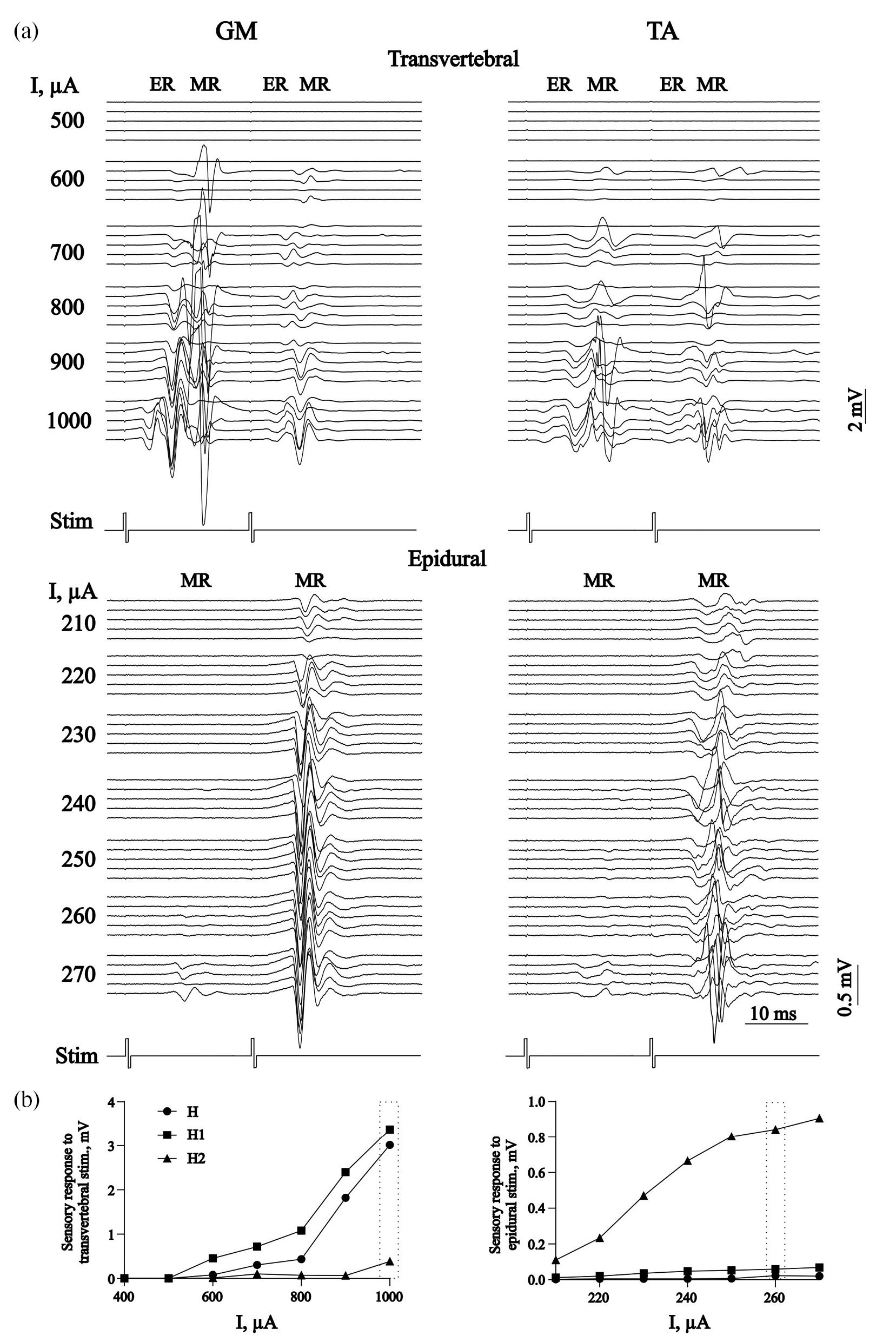 Типичная картина изменения ответов на двойные импульсы при ТС и ЭС по мере увеличения амплитуды тока стимуляции для мышц TA и GM, вызванные потенциалы которых подвергались статистической обработке, приведена на рис. 2a. При ТС в первую очередь появляются более длиннолатентные сенсорные компоненты ответа, предположительно имеющие моносинаптическую природу (MR). Затем, по мере увеличения амплитуды стимуляционного тока, возникают коротколатентные компоненты ответа, по-видимому, связанные с непосредственной стимуляцией вентральных корешков СМ (ER) [11]. Видно, что при ТС сенсорный компонент ответа на второй импульс имеет меньшую амплитуду, чем при ответе на первый импульс (H2 < H1). Напротив, при ЭС сегмента L2 наблюдаются только сенсорные компоненты ответа, имеющие моносинаптическую природу (MR) [5], причем сенсорный компонент ответа на второй импульс имеет большую амплитуду, чем при ответе на первый импульс (H2 > H1).