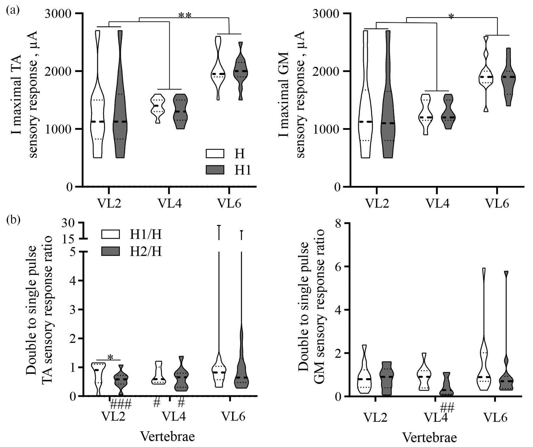 Рис. 3. Характеристики сенсорного компонента ответа m. tibialis anterior (TA) и m. gastrocnemius medialis (GM) при трансвертебральной стимуляции с межстимульным интервалом 20 мс: (a) — токи, при которых регистрировался максимальный сенсорный ответ на одиночный (H) и первый из пары (H1) импульс при стимуляции позвонков (Vertebrae) VL2, VL4, VL6. *, ** – p < 0.05, p < 0.01 отличия между токами стимуляции; (b) Отношения амплитуд сенсорных компонентов ответа на первый и второй импульсы пары к ответу на одиночный импульс (H1/H и H2/H соответственно). #, ##, ### – p < 0.05, p < 0.01, p < 0.001 отличия от ответа на одиночный импульс, *, ** – p < 0.05, p < 0.01 отличия между ответами на первый и второй импульс пары.