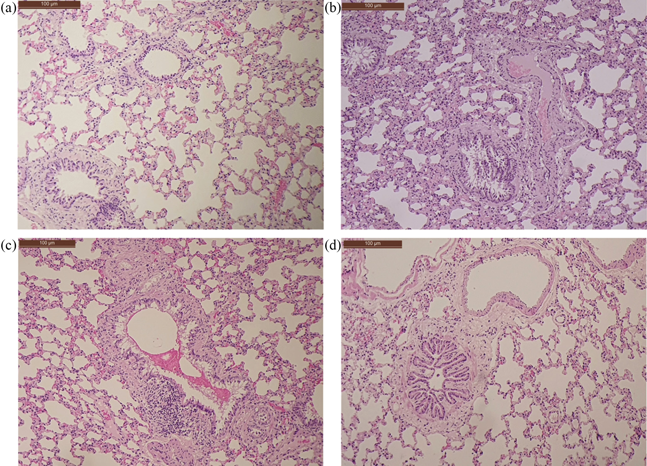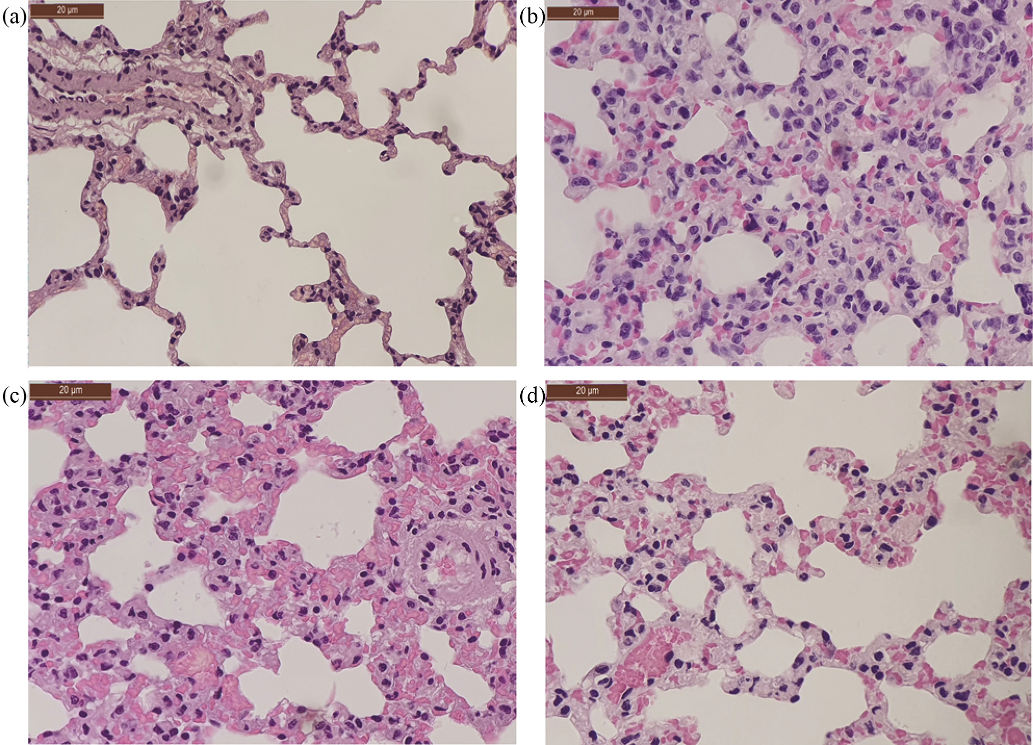 Рис. 6. Репрезентативные фотографии легких животных экспериментальных групп. (a) – контроль, альвеолы нормального строения и кровенаполнения; (b) – ДОКС, слабовыраженная гиперемия и умеренно выраженная инфильтрация лимфоцитами; (c) – НР+ДОКС, умеренно выраженная гиперемия; (d) – НР/НР+ДОКС, умеренно выраженная гиперемия. Окраска гематоксилином-эозином, ×400.