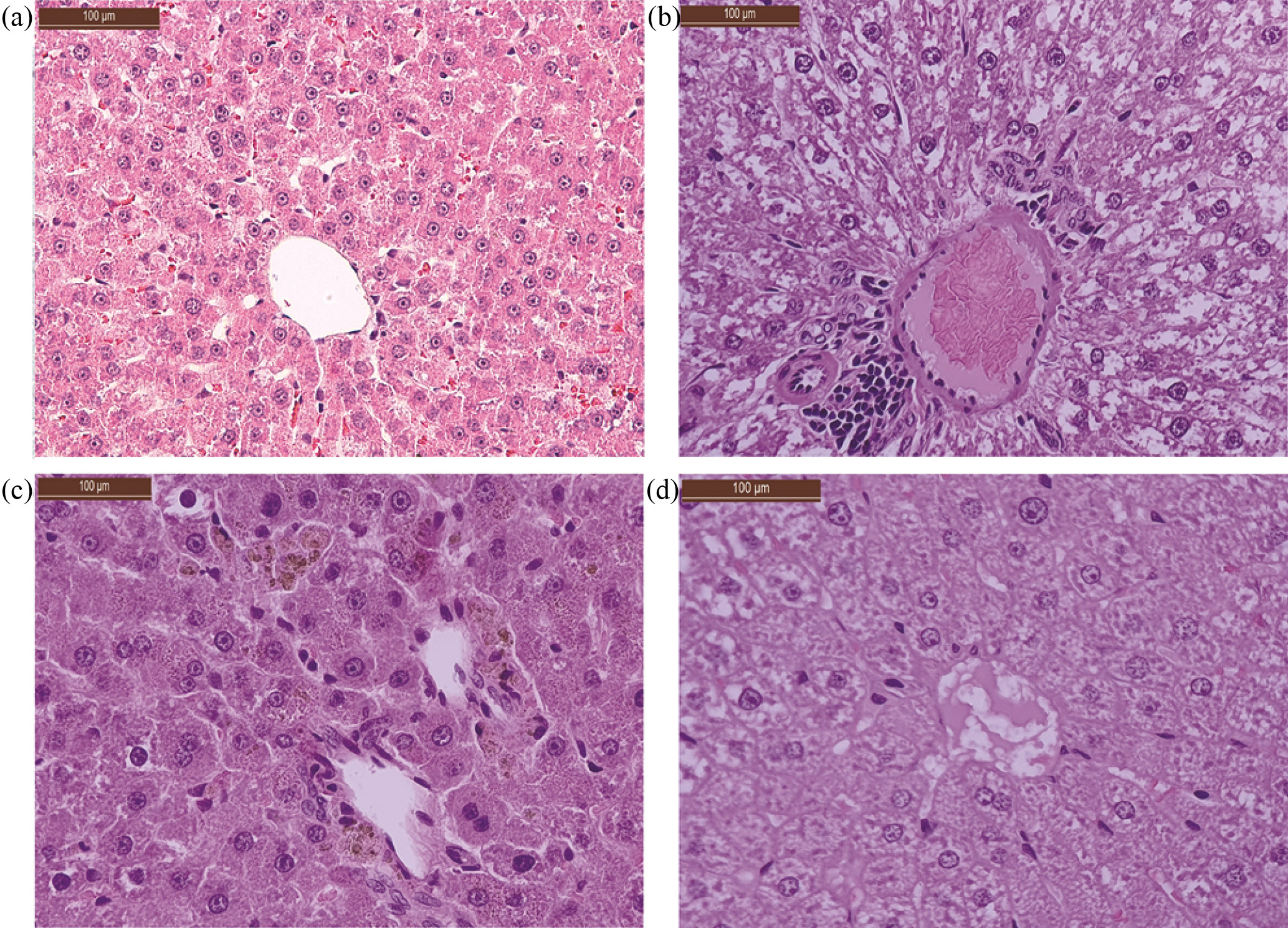 Рис. 8. Репрезентативные фотографии печени животных экспериментальных групп. (a) – контроль, нормальное строение; (b) – ДОКС, лимфоплазмоцитарная инфильтрация портального тракта; (c) – ДОКС, холестаз цитоплазматический; (d) – ДОКС, кариорексис в гепатоцитах. Окраска гематоксилином-эозином, ×200.