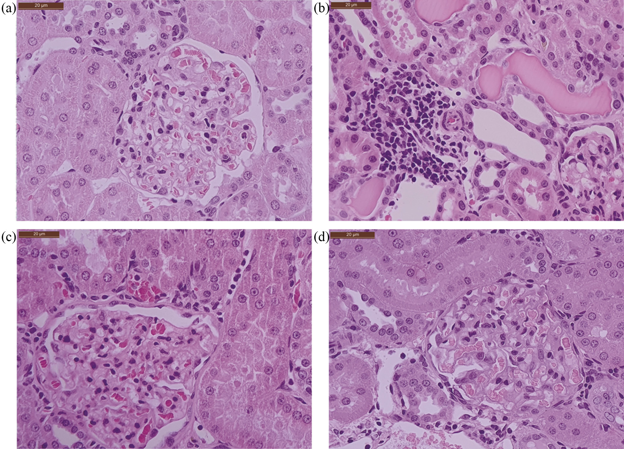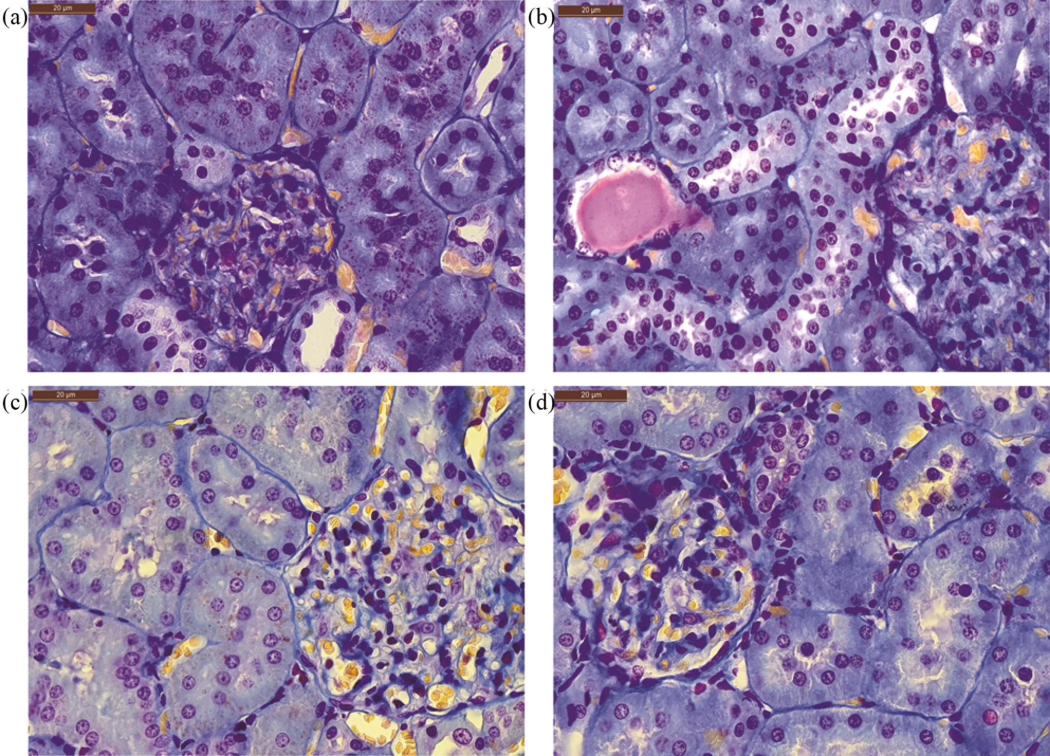 Рис. 9. Репрезентативные фотографии почки животных экспериментальных групп. (a) – контроль, нормальное строение; (b) – ДОКС, лимфоплазмоцитарная инфильтрация, гиалиновые цилиндры, атрофия эпителия канальцев; (c) – НР+ДОКС, слабовыраженные дистрофические изменения эпителия канальцев; (d) – НР/НР+ДОКС, слабовыраженные дистрофические изменения эпителия канальцев. Окраска гематоксилином-эозином, ×400.