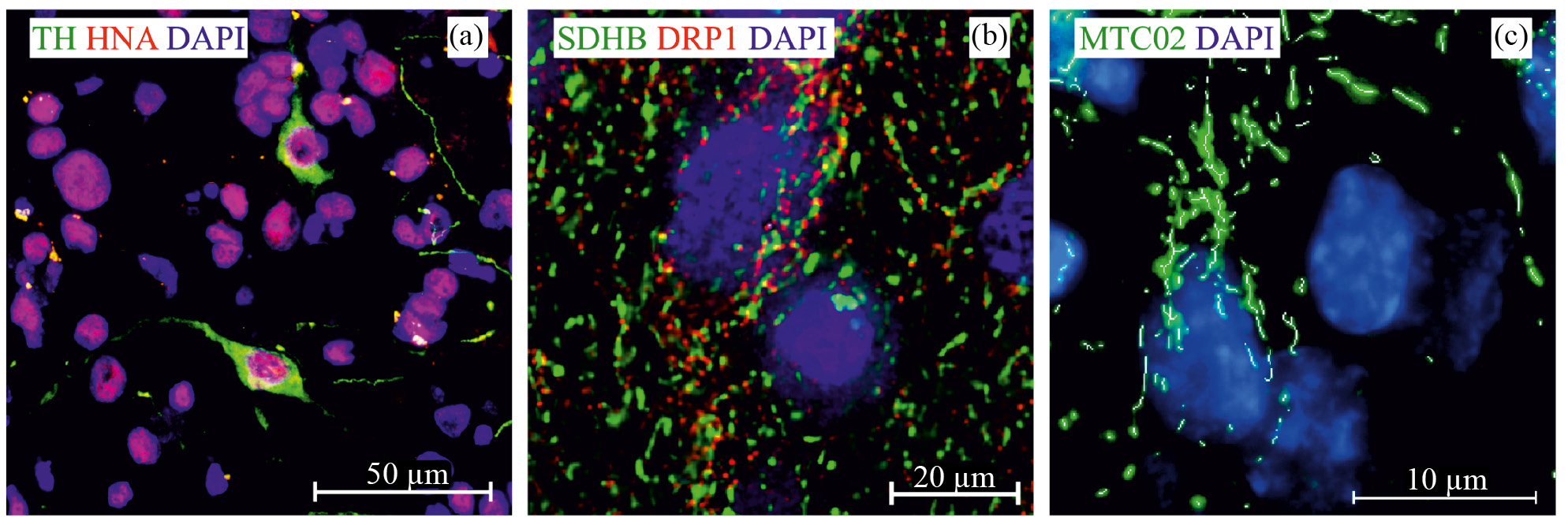 Трансплантированные клетки располагались по ходу иглы, область трансплантации имела отчетливые границы, а миграции нейронов за пределы трансплантата не выявили. Со временем плотность клеток в трансплантате снижалась, а их размеры увеличивались. На 3-й и 6-й месяц после операции в трансплантате выявляли нейроны человека, содержащие тирозингидроксилазу — маркерный белок дофаминовых нейронов (рис. 1а). Двойное выявление митохондриальных белков MTC02 (маркер наружной мембраны митохондрий) и SDHB (маркер внутренней мембраны митохондрий) позволило выявить в клетках трансплантата скопления митохондрий. Двойное окрашивание на Drp1 и SDHB продемонстрировало ассоциацию Drp1 и митохондриальной сети (рис. 1).