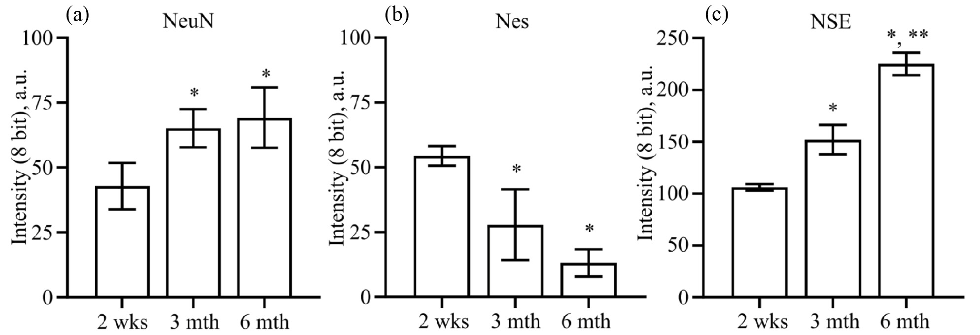 По мере созревания трансплантата, начиная со второй недели, увеличивалась интенсивность флуоресценции при выявлении NeuN (рис. 2, 4), что согласуется со сроками увеличения экспрессии NSE (рис. 2, 4), и ранее показанном нами в сходном эксперименте [14] снижением экспрессии даблкортина (маркера нейрональных предшественников), развитием отростков и экспрессией синаптофизина в трансплантированных нейронах. При этом, выявление нестина (Nes) — маркера нейрональных предшественников, демонстрировало обратную динамику. Если ко второй неделе в области введения обнаруживали многочисленные Nes-позитивные клетки, то к шестому месяцу интенсивность флуоресценции при выявлении нестина в трансплантате было резко снижено (ANOVA, F(2,12) = 28.78; p < 0.001).