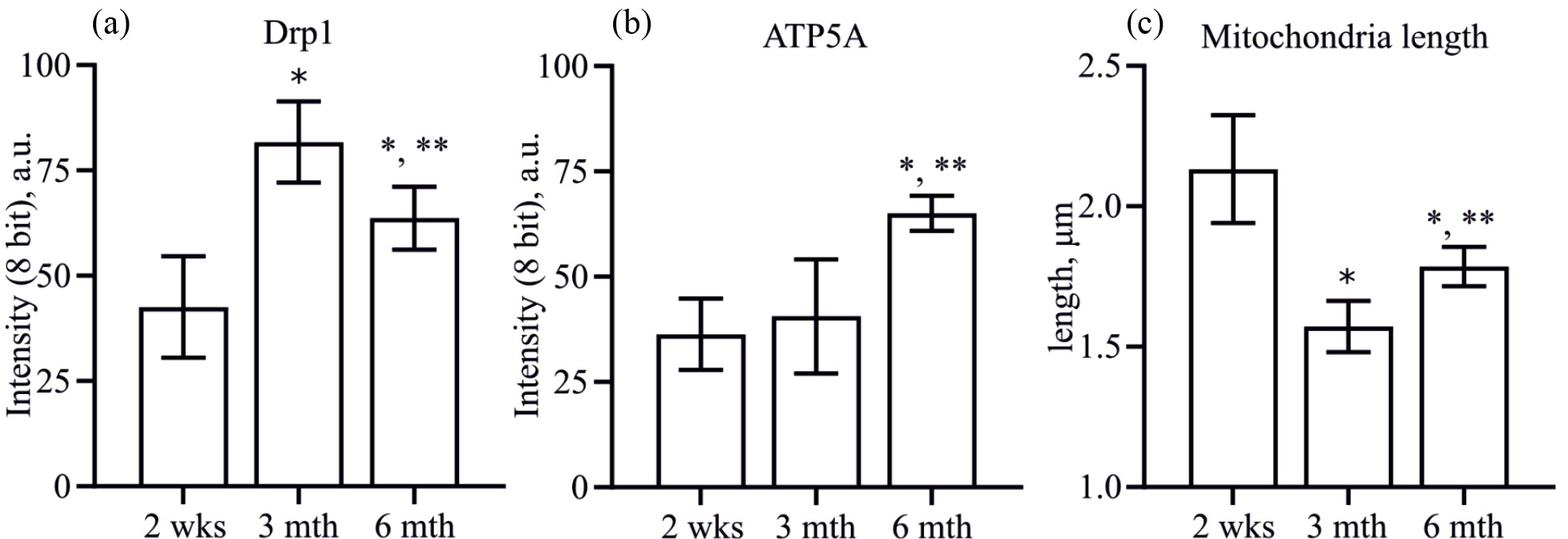 Выраженные изменения выявили и при оценке среднего объема митохондрий в клетке — доля, занимаемая MTC02-позитивными структурами (area fraction) в перинуклеарной области, возрастала с 2.99 ± 0.17% на второй неделе, до 4.39 ± 0.71% к шестому месяцу после введения (F(2,12) = 13.64; p < 0.001), что, по-видимому, связано с увеличением количества и размеров митохондрий и митохондриальных кластеров.