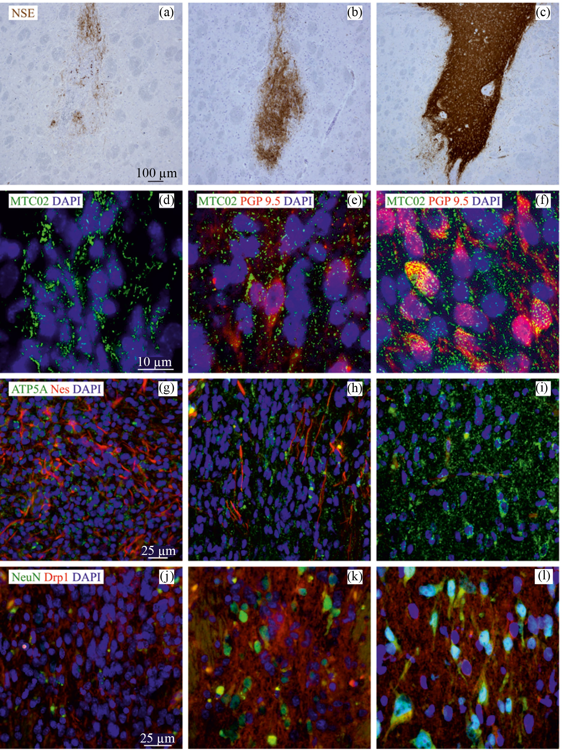 (a, b, c) – Выявление нейрональной енолазы (NSE); (d, e, f) – Выявление белка наружной мембраны митохондрий (MTC02, зеленым), на (e) и (f) дополнительно показан нейрональный маркер PGP 9.5 (красным); (g, h, i) – Выявление АТФ-синтазы (ATP5A, красным) и нестина (Nes, зеленым); (j, k, l) – Выявление Drp1(красным) и нейронального маркера NeuN (зеленым).