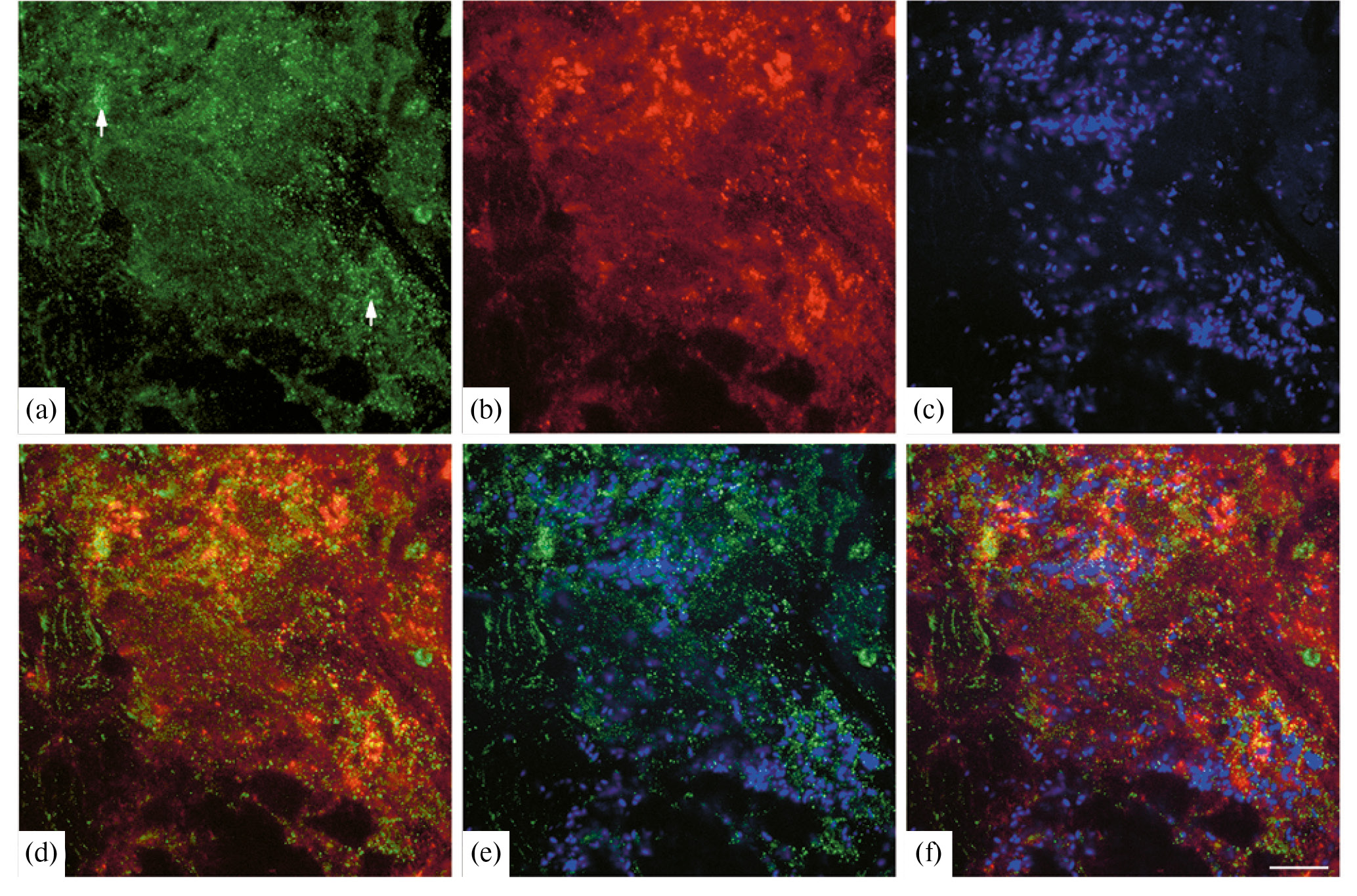 После отмывки в фосфатно-солевом буфере, препараты помещали в раствор фосфатно-солевого буфера с глицерином (1 : 1) и размещали на предметном стекле для проведения микроскопического исследования на лазерном сканирующем конфокальном микроскопе Leica TCS SP5 MP (Leica Microsystems, США) с использованием масляно-иммерсионного объектива 63×/1.4. Для возбуждения эмиссии флуорофоров применялся Ar и He-Ne лазеры. Применяли следующие длины волн лазеров: для антител, меченных флуорофорами Alexa 488 — 488 нм, Alexa 647 — 633 нм; для меченного полипептида ТМР-α-Б — 543 нм. Анализ полученных конфокальных изображений проводили в программе ImageJ (NIH, США; веб-сайт программы https://imagej.net/ij/).