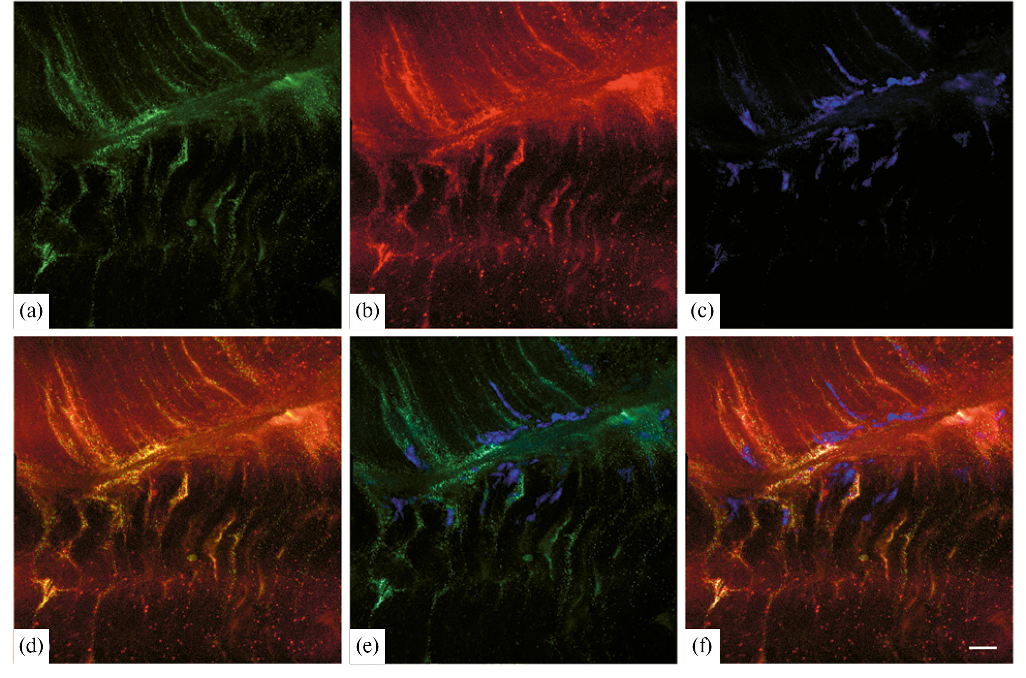Рис. 6. Наличие кальциневрина А при флуоресцентном тройном мечении препарата соматических мышечных клеток дождевого червя. (a) – Иммуномечение антителами к кальциневрину А (зеленый цвет); (b) – иммуномечение антителами к пресинаптическому белку синаптофизину (красный цвет); (c) – мечение нАХР при помощи ТМР-α-Б (синий цвет); (d) – наложение изображений (a) и (b); (e) – наложение изображений (a) и (c); (f) – наложение изображений (a), (b) и (c). Масштаб 20 µm.