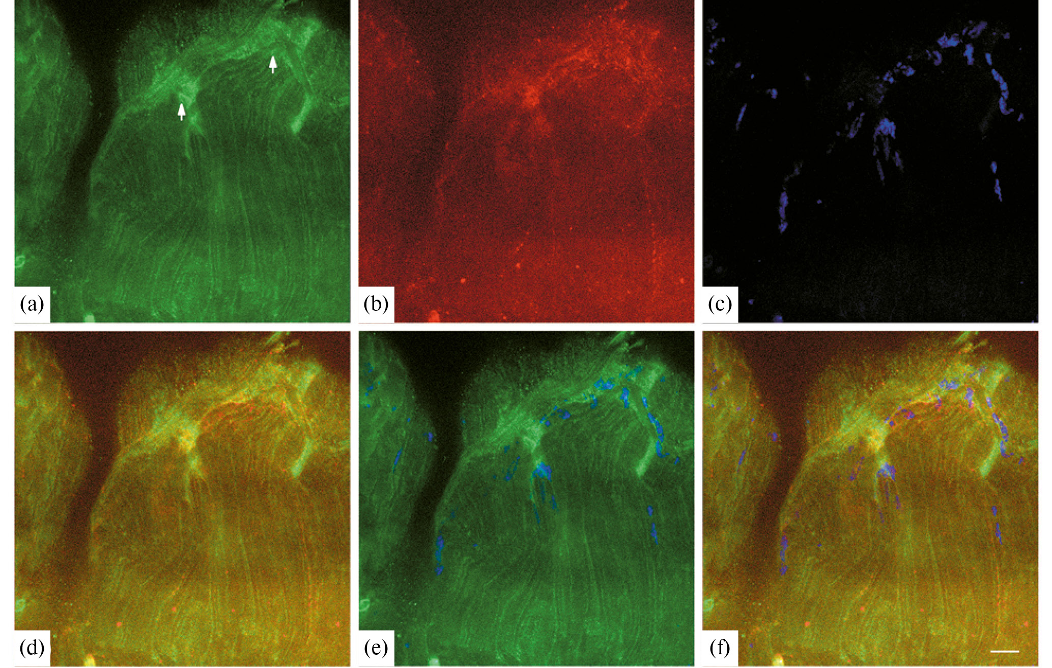 Рис. 1. Флуоресцентное тройное мечение препарата соматических мышечных клеток дождевого червя Lumbricus terrestris. (a) — Иммуномечение антителами к кальмодулину (зеленый цвет); стрелки указывают на места более интенсивного мечения; (b) — иммуномечение антителами к пресинаптическому белку синаптофизину (красный цвет); (c) — мечение ТМР-α-Б постсинаптических нАХР (синий цвет); (d) — наложение изображений (a) и (b); (e) — наложение изображений (a) и (c); (f) — наложение изображений (a), (b) и (c). Масштаб 20 µm.