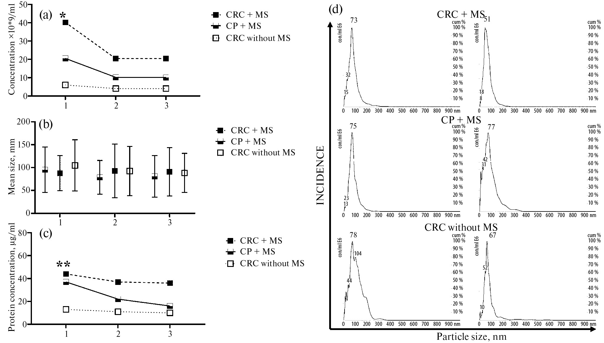 Рис. 2. Концентрация, размер ВВ и уровень общего белка во фракциях и супернатанте при иммунопреципитации. (a) — концентрация ВВ в препаратах: 1 — до иммунопреципитации, 2 — в супернатанте после иммунопреципитации CD11b-позитивных ВВ, 3 — в супернатанте после последовательной иммунопреципитации CD11b-позитивных и FABP4-позитивных ВВ у больных КРР с метаболическими нарушениями (CRC+МS) (темные боксы), у больных ПТК с метаболическими нарушениями (СP+MS) (штрихованные боксы), и больных КРР без метаболических нарушений (CRC without MS) (светлые боксы). * — различия достоверны по сравнению с концентрацией ВВ у больных CP+MS и CRC without MS, p < 0.05. (b) — средний размер везикул у больных в супернатантах до и после иммунопреципитации; (с) — концентрация белка в образцах ВВ больных в супернатантах до и после иммунопреципитации, ** — различия достоверны по сравнению с концентрацией белка в везикулах у больных CRC without MS, p < 0.05. (d) — данные анализа NTA в образцах циркулирующих ВВ больных до иммунопреципитации (слева) и после иммунопреципитации СD11b-позитивных ВВ (справа). Ось абсцисс представляет собой размер частиц (нм), ось ординат — концентрацию частиц (частиц/мл), вспомогательная ось — кумулятивная частота (%).