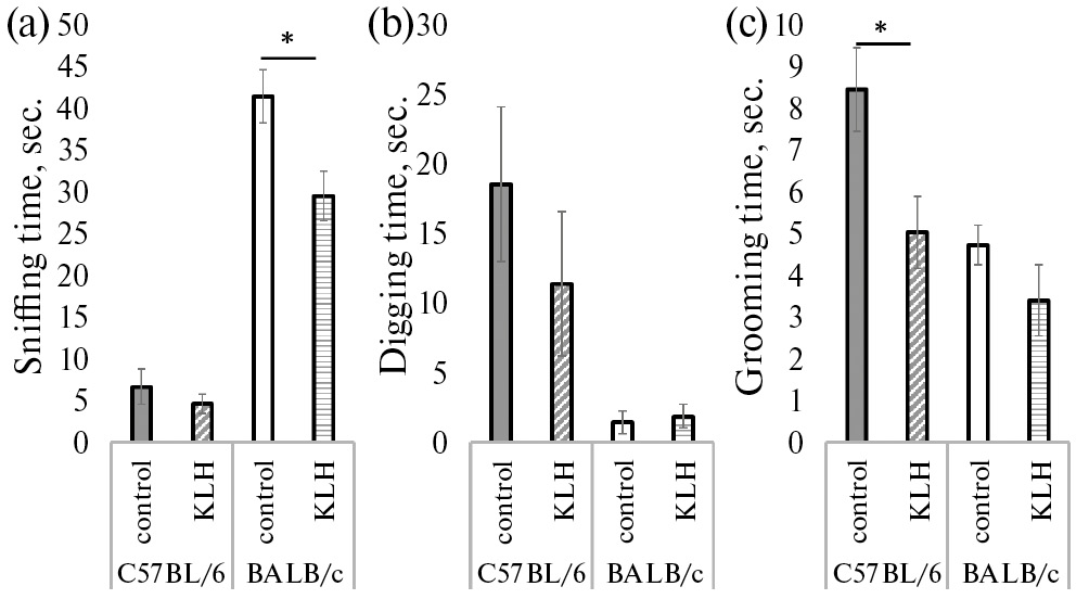 Самки линии BALB/c тратили больше времени на обнюхивание обонятельного стимула, чем C57BL/6 (рис. 1). Однако самки C57BL/6 демонстрировали более продолжительное копание и груминг по сравнению с самками мышей BALB/c. При этом иммунный статус самца, от которого был получен образец мочи, достоверно влиял на продолжительность обнюхивания стимула самками BALB/c (p = 0.026, HSD-тест): самки тратили меньше времени на обнюхивание обонятельных стимулов от иммунизированных самцов, чем от контрольных самцов (рис. 1).
