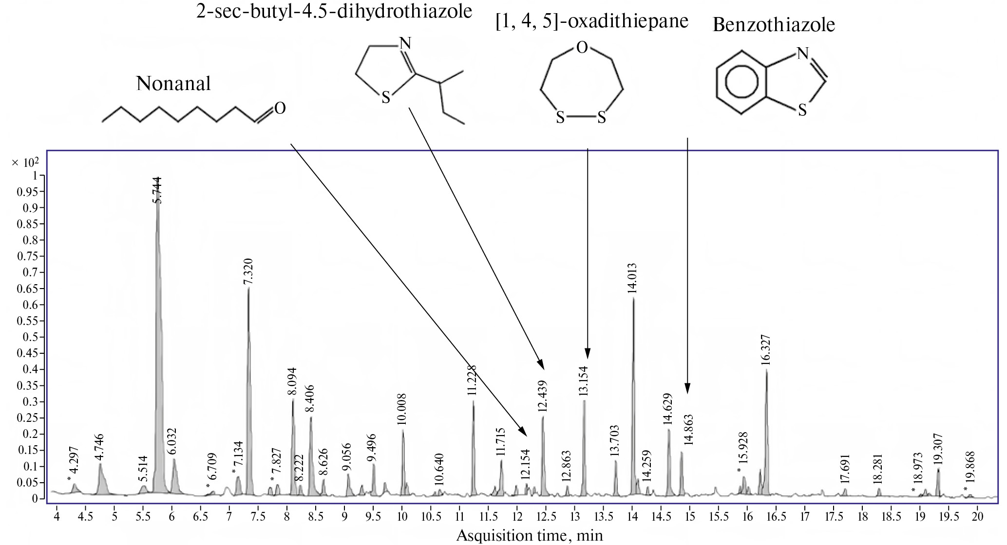 Рис. 2. Пример хроматограммы ГХ-МС контрольного самца линии BALB/c. Высота пиков, указанных выше четырех летучих органических соединений, значимо увеличивается у иммунизированных животных по сравнению с контрольными образцами.