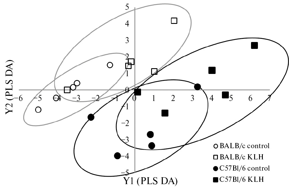 Рис. 3. Распределение отдельных паттернов ЛОС в пространстве осей Y1 и Y2 (PLS DA). Точки представляют самцов мышей линий C57BL/6 и BALB/c до (контроль) и через 3 дня после (KLH) введения антигена.