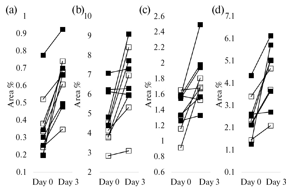 Рис. 4. Изменения относительных концентраций 4 соединений в моче иммунизированных самцов. Черные квадраты — самцы C67BL/6, белые квадраты — самцы BALB/c. (a) — Нонаналь, (b) — 2-втор-бутил-4,5-дигидротиазол, (c) — [1, 4, 5]-оксадитиоэпан, (d) — Бензотиазол.