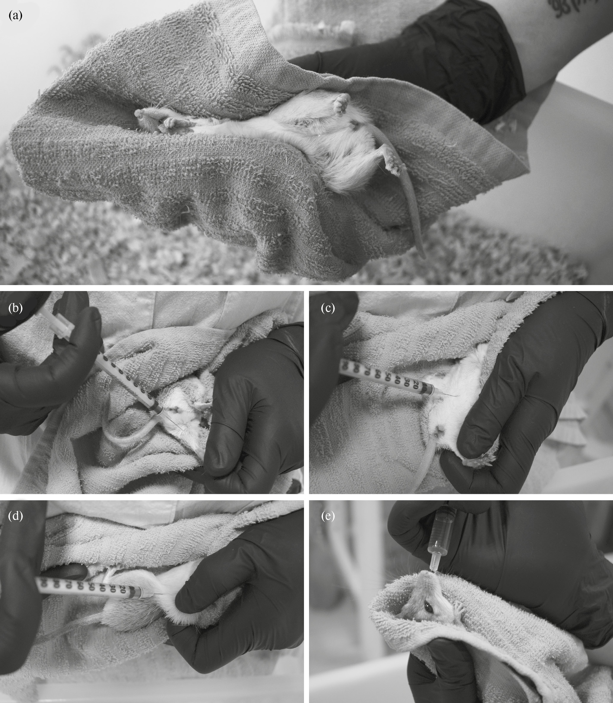 Рис. 3. Фиксация животного в полотенце (a) и последующее проведение рутинных процедур: (b) — внутримышечная инъекция в область голени, (c) — внутрибрюшинная инъекция, (d) — подкожная инъекция в складку на боку, (e) — выпаивание.