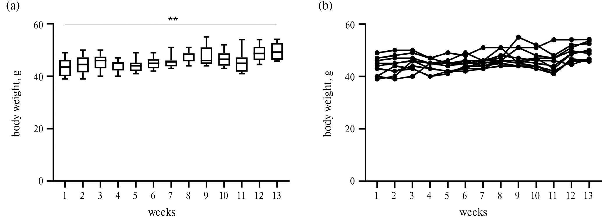 Рис. 6. Динамика веса самцов во время 13-недельного мониторинга. (a) — Средние данные по группе. (b) — Индивидуальные значения для всех животных. ** р < 0.01.