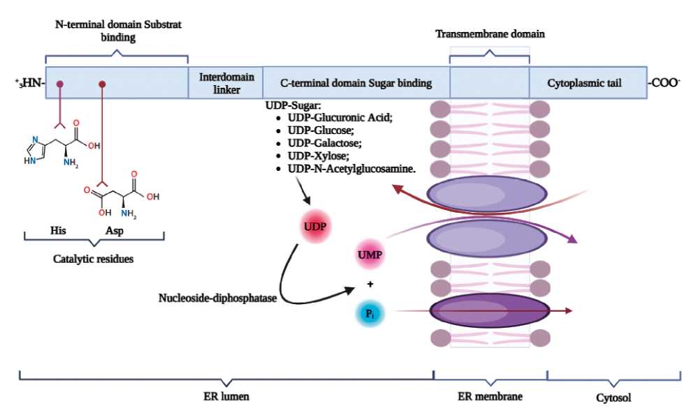Белок UGT содержит два основных домена, известных как агликоновый или субстрат-связывающий домен, расположенный на N-конце, и сахар-связывающий домен на C-конце [21, 43, 61]. В принятой модели топологии большая часть мономера UGT локализована на люминальной стороне ER [11, 52], где происходит конъюгация [38], с единственной трансмембранной областью вблизи С-конца, за которой следует короткий цитоплазматический домен [18, 56] (рис. 1). Липофильные соединения обычно могут пассивно проникать через мембрану ER к активному центру фермента [1]. UDP‐сахара, синтезирующиеся в цитозоле, транспортируются в просвет ER с помощью нуклеотидных сахарных транспортеров (NST) [60]. Транслокация образовавшихся гликозидов (глюкуронидов) в цитозольный домен опосредована переносчиками органических анионов [38]. Вторым продуктом реакции является UDP [1], который гидролизуется нуклеозиддифосфатазой до UMP и становится антипортовым партнером для соответствующих NST [55].