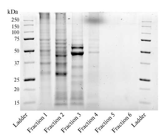 Стандартная методика электрофоретического разделения не позволила визуально определить следовые количества белка, содержащегося во фракциях №№ 5–6.