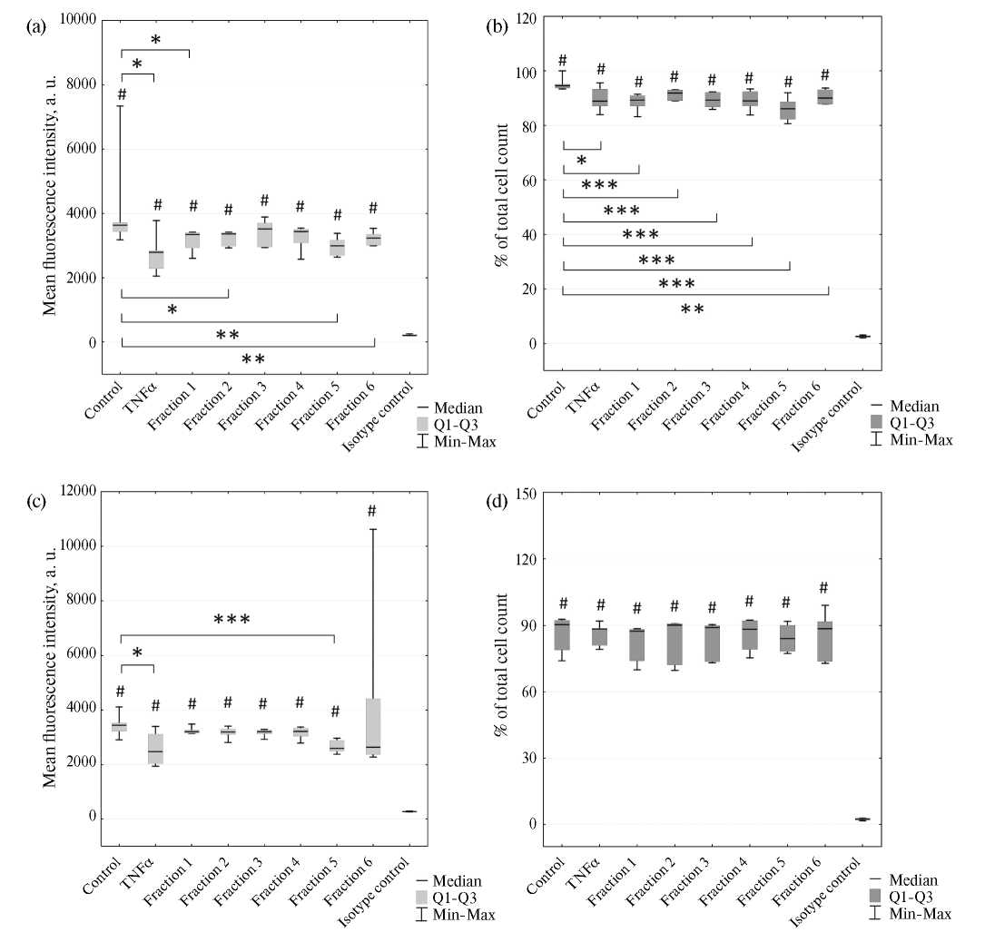 Рис. 3. Фенотипические характеристики клеток трофобласта линии JEG-3, экспрессирующих поверхностные маркеры в присутствии фракций лизата естественных киллеров линии NK-92: (а) — интенсивность экспрессии CD105; (b) — относительное количество клеток, экспрессирующих CD105; (c) — интенсивность экспрессии TRAIL-R2; (d) — относительное количество клеток, экспрессирующих TRAIL-R2. Достоверность различий: *p < 0.05; **p < 0.01; ***p < 0.001 относительно контроля (спонтанная экспрессия); #p < 0.001 относительно изотипического контроля