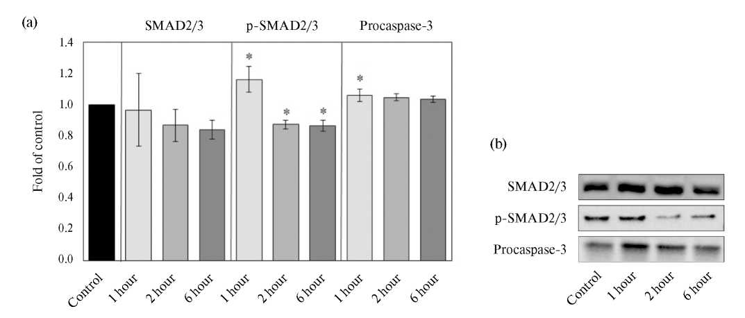 Рис. 6. (а) — Оценка содержания SMAD2/3, p-SMAD2/3 и прокаспазы-3 в клетках трофобласта линии JEG-3 после сокультивирования с фракцией №1 (0.1 мкг/мл среды) лизата клеток естественных киллеров линии NK-92 в течение одного, двух и шести часов (достоверность различий относительно контроля: *p < 0.05); (b) — репрезентативные изображения иммуноблотов белков интереса SMAD2/3, p-SMAD2/3 и прокаспазы-3 в клетках трофобласта линии JEG-3 в тех же условиях