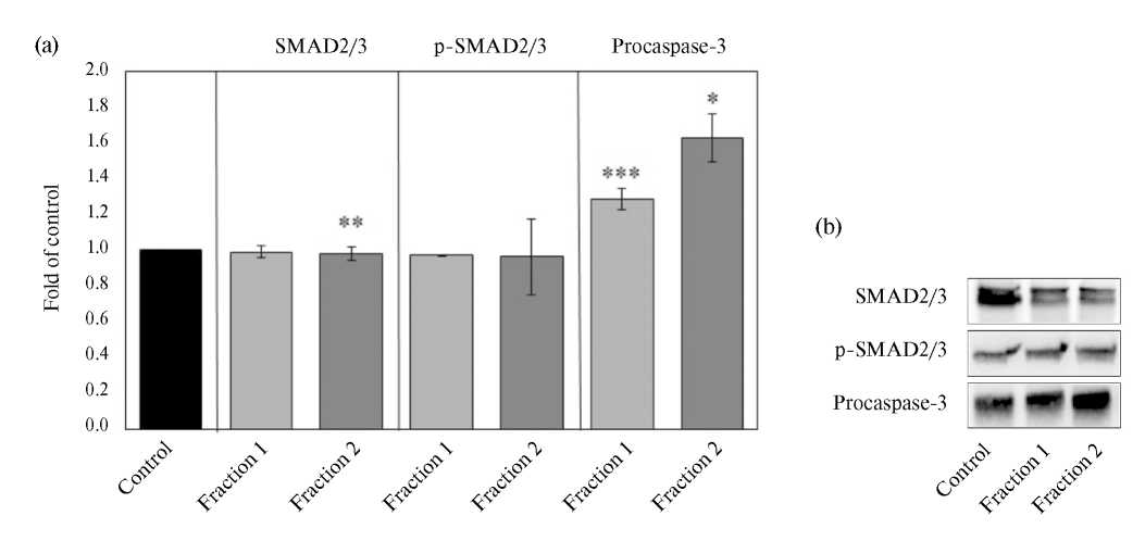 Рис. 7. (а) — Оценка содержания SMAD2/3, p-SMAD2/3 и прокаспазы-3 в клетках трофобласта линии JEG-3 после сокультивирования с фракциями №№1-2 (1.0 мкг/мл среды) лизата клеток естественных киллеров линии NK-92 в течение 24 часов (достоверность различий относительно контроля: *p < 0.05; **p < 0.01; ***p < 0.001); (b) — репрезентативные изображения иммуноблотов белков интереса SMAD2/3, p-SMAD2/3 и прокаспазы-3 в клетках трофобласта линии JEG-3 в тех же условиях