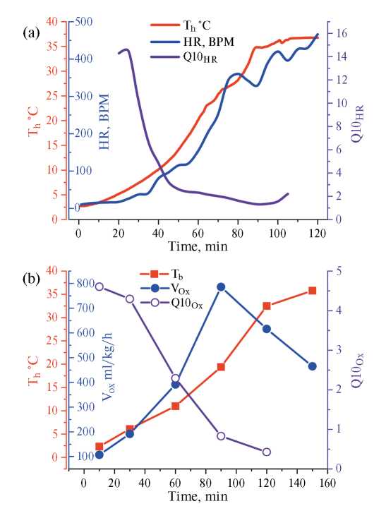 Для оценки реакции организма на изменение Tb используют удобный и наглядный критерий: температурный коэффициент Q10, определяемый как скорость физиологического процесса при определенной температуре по сравнению со скоростью при температуре на 10°С ниже или выше [27–29]. Согласно правилу Вант Гоффа — Аррениуса считается, что величина Q10 ~ 2 отражает естественное влияние температуры на химические реакции. В исследованиях температурной зависимости физиологических процессов, включая HR и VOx, проводимых на различных животных и людях, среднее значение Q10 обычно находится в пределах от 2 до 3 [30–33].