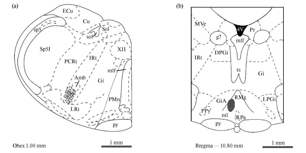 Обозначения на (a): Amb — двойное ядро, Cu — клиновидное ядро, ECu — внешнее клиновидное ядро, Gi — гигантоклеточное ретикулярное ядро, IRt — промежуточное ретикулярное ядро, LRt — латеральное ретикулярное ядро, ml — медиальный лемниск, mlf — медиальный продольный пучок, PCRt — мелкоклеточное ретикулярное ядро, PMn — парамедианное ретикулярное ядро, py — пирамидный тракт, sol — одиночный тракт, Sol — ядро одиночного тракта, sp5 — спинальный тройничный тракт, Sp5I — интерполярная часть спинального ядра тройничного нерва, XII — ядро подъязычного нерва. Обозначения на (b): 4V — IV желудочек мозга, DPGi — дорсальное парагигантоклеточное ядро, g7 — колено лицевого нерва, Gi — гигантоклеточное ретикулярное ядро, GiA — часть альфа гигантоклеточного ретикулярного ядра, IRt — промежуточное ретикулярное ядро, LPGi — латеральное парагигантоклеточное ядро, ml — медиальный лемниск, mlf — медиальный продольный пучок, MVe — медиальное вестибулярное ядро, PPy — парапирамидное ядро, Pr — препозитное ядро, py — пирамидный тракт, RMg — большое ядро шва, RPa — бледное ядро шва, ts — покрышечно-спинномозговой путь