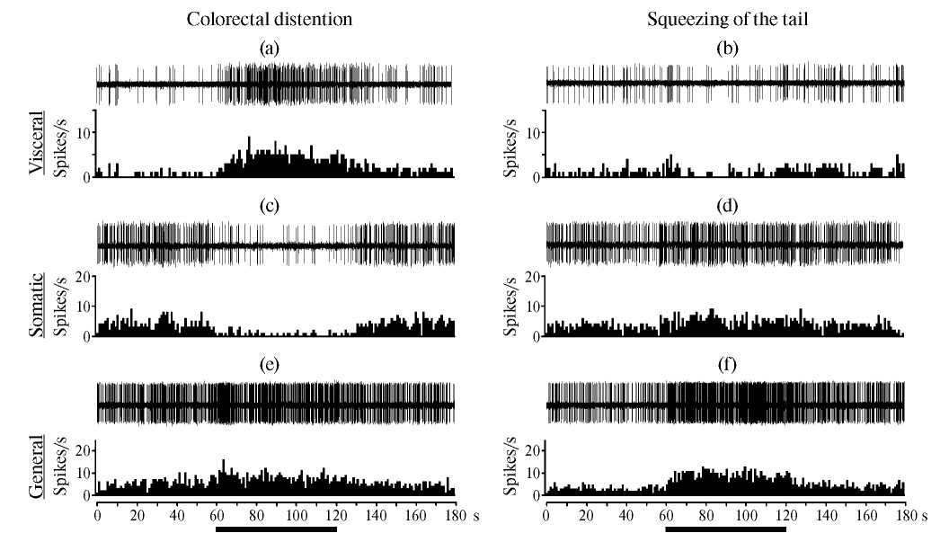 Рис. 2. Примеры реакций нейронов каудальной вентролатеральной ретикулярной области продолговатого мозга, относящихся к висцеральному (a, b), соматическому (c, d) и общему (e, f) ноцицептивным типам, на болевые колоректальное растяжение (colorectal distension) и сдавливание хвоста (squeezing of the tail). На (a — f), в верхней части — нативные записи импульсной активности, в нижней части — соответствующие частотные гистограммы с бином в 1 с. По оси абсцисс — время в секундах, по оси ординат — частота разрядов (spikes/s). Горизонтальные отрезки — время действия раздражений