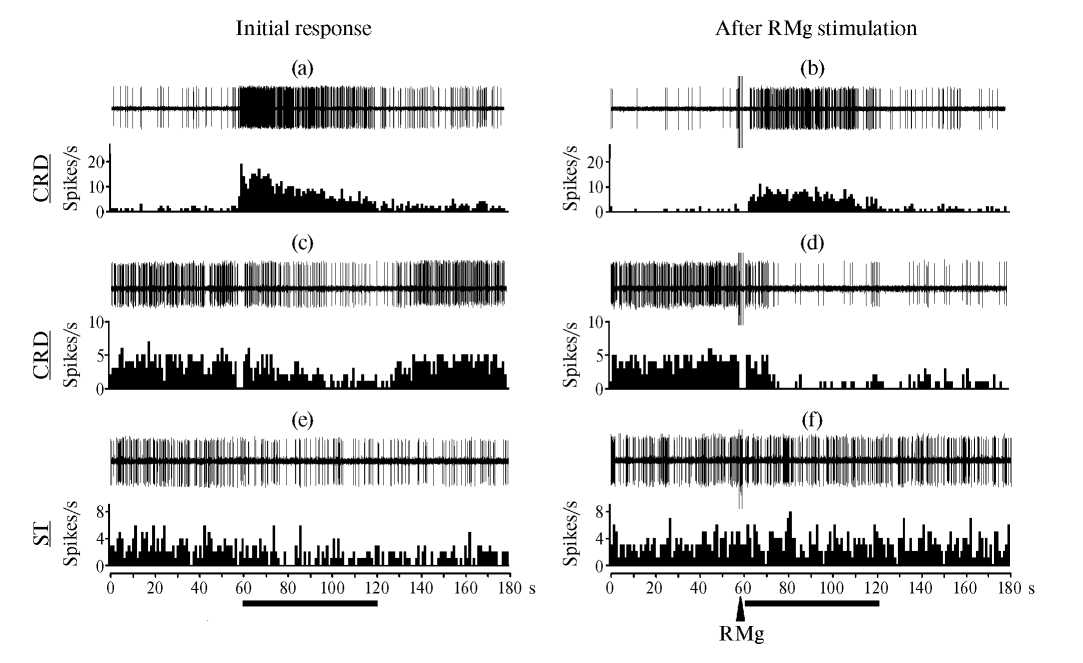 Рис. 3. Примеры возбуждающей (a, b) и тормозных (c — f) реакций ноцицептивных нейронов каудальной вентролатеральной ретикулярной области продолговатого мозга на болевые колоректальное растяжение (CRD) и сдавливание хвоста (ST) исходно (a, c, e) и после электростимуляции большого ядра шва (b, d, f). На (a — f), в верхней части — нативные записи, ниже — соответствующие частотные гистограммы с бином в 1 с. По оси абсцисс — время в секундах, по оси ординат — частота разрядов (spikes/s). Горизонтальные отрезки — время действия болевых раздражений. Стрелка — электрическая стимуляция большого ядра шва (RMg)