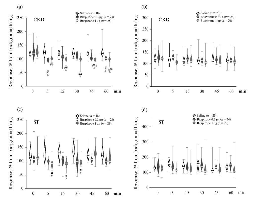 Рис. 5. Эффекты электрической стимуляции большого ядра шва на возбуждение нейронов каудальной вентролатеральной ретикулярной области продолговатого мозга, вызванное болевыми колоректальным растяжением (CRD) и сдавливанием хвоста (ST), после интрацеребровентрикулярного введения агониста 5-HT1A рецепторов буспирона в количествах 0.3 и 1 мкг у здоровых (a, c) и перенесших колит (b, d) крыс. По оси абсцисс — время до (0) и после инъекции в мин. По оси ординат — реакция в % от уровня фоновой активности. На (a — d), верхний и нижний углы каждого ромба — первый и третий квартили (25-й и 75-й процентили соответственно), горизонтальная линия внутри — медиана (50-й процентиль), концы отрезков — 10-й и 90-й процентили. Значимые изменения по сравнению с соответствующим исходным уровнем: # р < 0.05, ## р < 0.01 и ### p < 0.001, парный тест Вилкоксона. Значимые различия по сравнению с инъекцией физиологического раствора: * р < 0.05, тест Манна–Уитни–Вилкоксона. Значимость изменений дана с учетом поправки Бонферрони