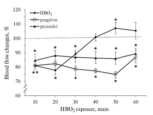 Рис. 3. Изменение кровотока в стриатуме крыс при дыхании кислородом под давлением 5 АТА после введения паргилина (25 мг/кг) и пиразидола (25 мг/кг). *р < 0.05 по отношению к кровотоку при дыхании воздухом (пунктирная линия)