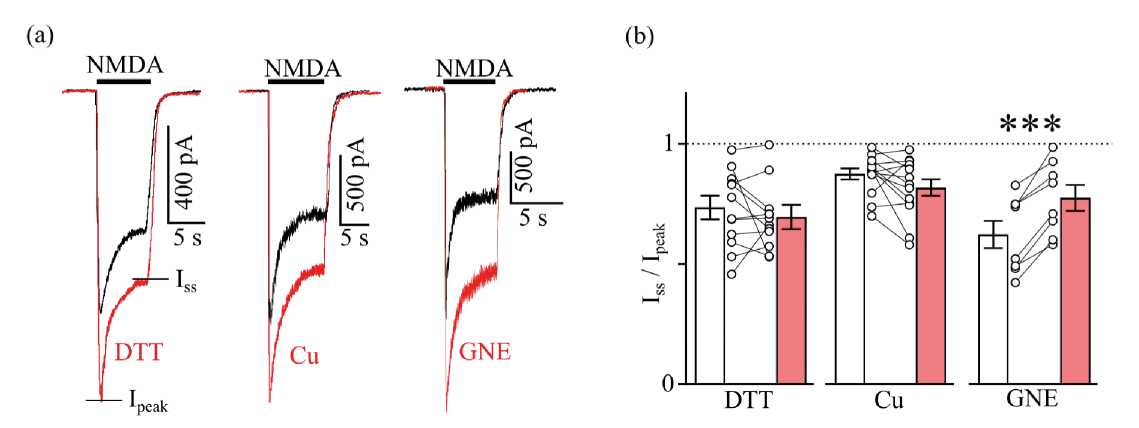 (a) – Примеры токов NMDA-рецепторов, зарегистрированных в конфигурации целой клетки на нейронах при аппликации 100 мкМ NMDA в присутствии 30 мкМ глицина. Vm= – 70 мВ при постоянной концентрации внеклеточного кальция 1 мМ. Черные кривые – токи в контроле. Красные кривые – на фоне действия дитиотреитола (DTT, 1 мМ), CuSO4 (Cu, 5 мкМ) или GNE-9278 (GNE, 10 мкМ). Степень десенситизации оценивали по отношению амплитуд равновесного тока к пиковому (Iss / Ipeak). (b) – Средние значения отношения Iss / Ipeak в контроле (белые столбики) и на фоне действия аллостерических модуляторов (красные столбики). Кружки показывают результаты измерений в отдельных нейронах: DTT (n = 14), Cu (n = 12), GNE (n = 8). *** – отличие от контроля в присутствии GNE, p = 0.0002, парный t-критерий Стьюдента