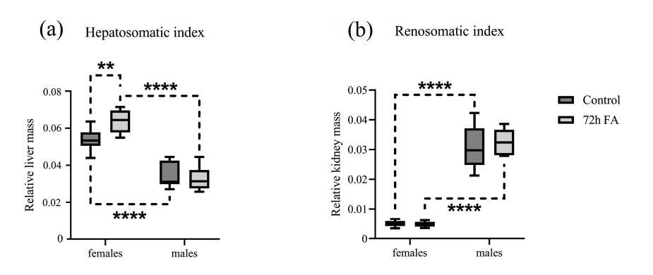 Рис. 1. Изменение гепатосоматического (а) и реносоматического (b) индексов в группах самок и самцов колюшек в зависимости от пола и адаптации к пресной воде. По оси Y: относительная масса печени (а) и почек (b). По оси X: группы самок (“females”) и самцов (“males”) трёхиглой колюшки в условиях морской воды (“control”, тёмно-серые ящики) и после 72-часовой пресноводной адаптации (“72h FA”, светло-серые ящики). Количество в каждой группе: n = 10. Пунктирная линия указывает группы, между которыми обнаружены статистически значимые различия (** – p < 0.01; ** – p < 0.0001, two-way ANOVA)