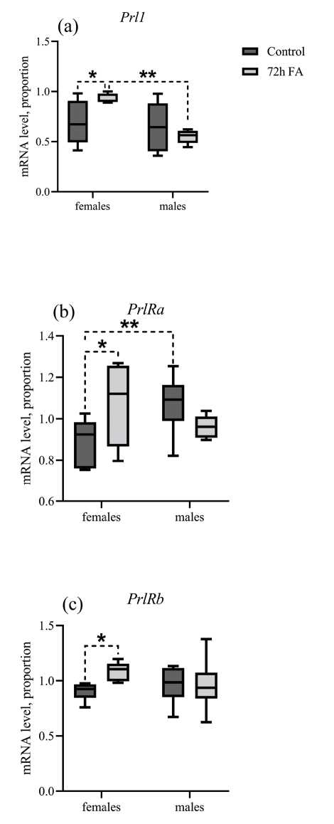 Рис. 2. Экспрессия генов Prl1, PrlRa и PrlRb в ткани мозга самок и самцов колюшек в зависимости от пола и адаптации к пресной воде. По оси Y: относительные уровни мРНК генов пролактина Prl1 (a) и пролактиновых рецепторов PrlRa (b) и PrlRb (c) в ткани мозга. По оси X: группы самок (“females”) и самцов (“males”) трёхиглой колюшки в условиях морской воды (“control”, тёмно-серые ящики) и после 72-часовой пресноводной адаптации (“72h FA”, светло-серые ящики). Количество в каждой группе: n = 10. Пунктирная линия указывает группы, между которыми обнаружены статистически значимые различия (* – p < 0.05; ** – p < 0.01, two-way ANOVA)