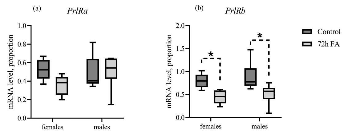 Рис. 4. Экспрессия генов PrlRa и PrlRb в ткани жабр самок и самцов колюшек в зависимости от пола и адаптации к пресной воде. По оси Y: относительные уровни мРНК генов пролактиновых рецепторов PrlRa (a) и PrlRb (b) в ткани жабр. По оси X: группы самок (“females”) и самцов (“males”) трёхиглой колюшки в условиях морской воды (“control”, тёмно-серые ящики) и после 72-часовой пресноводной адаптации (“72h FA”, светло-серые ящики). Количество в каждой группе: n = 10