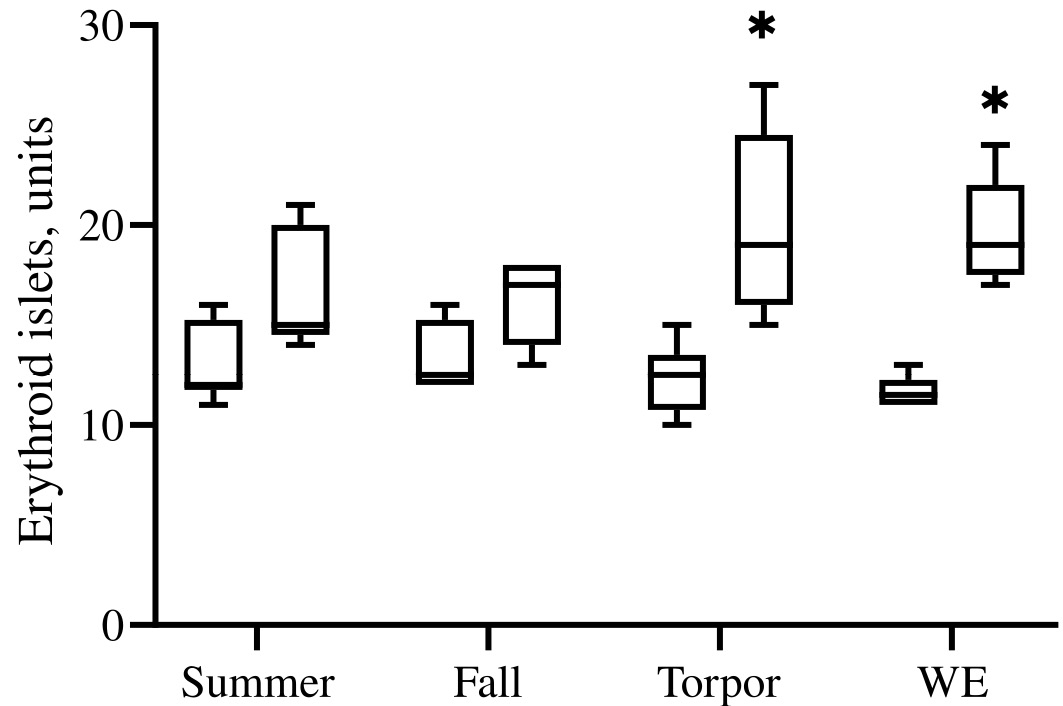 Сравнение количества эритроидных островков (ЭО) показало достоверную разницу между их количеством в КМП и КМБ. Осенью, в торпидном состоянии и во время зимней эутермии в КМБ содержится в 1.4, 1.5 и в 1.7 раз больше ЭО, чем в КМП, соответственно. В летний период значимых различий не обнаружено (рис. 2).