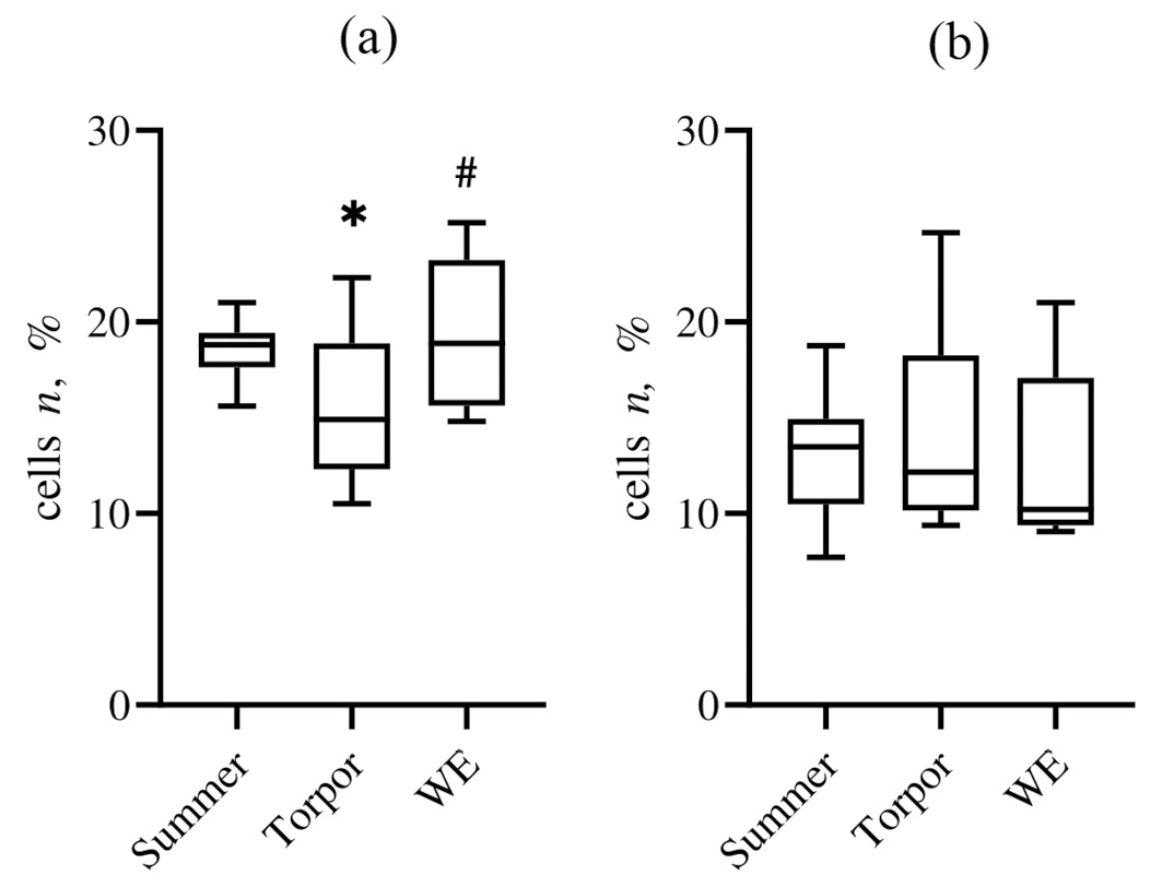 Рис. 3. Процентное содержание ядерных клеток в S-фазе клеточного цикла в костном мозге (а) – плечевой кости по [1] и (b) – в бедренной кости сусликов в активном летнем, торпидном и зимнем эутермном состоянии (n = 11 лето, n = 12 торпор, n = 11 ЗЭ). * – p <0.05 между экспериментальными группами по сравнению с контрольной группой “лето”, # – p <0.05 между группами “торпор” и “зимняя эутермия”.