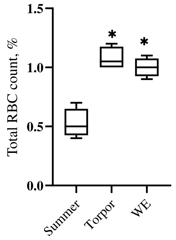 Мы обнаружили также значительное увеличение количества ретикулоцитов в крови в торпоре (рис. 6) и их уровень после пробуждения не изменялся. Так как уровень пролиферации в КМБ в период торпора (рис. 3) и гены, необходимые для производства эритроцитов, сохраняются на летнем уровне экспрессии [27], а уровень, например, синтеза лейкоцитов в костном мозге снижается [30], мы предполагаем, что во время торпора в КМ преобладает продукция именно эритроцитов, а не предшественников других клеток. В зимнюю эутермию количество ретикулоцитов достоверно не снижается, поскольку необходимо постоянное активное обновление эритроцитарных клеток, а как уже сказано сворачиваться они способны всего один раз [29], а число баутов (циклов засыпаний- пробуждений) во время спячки в десятки раз больше [14].