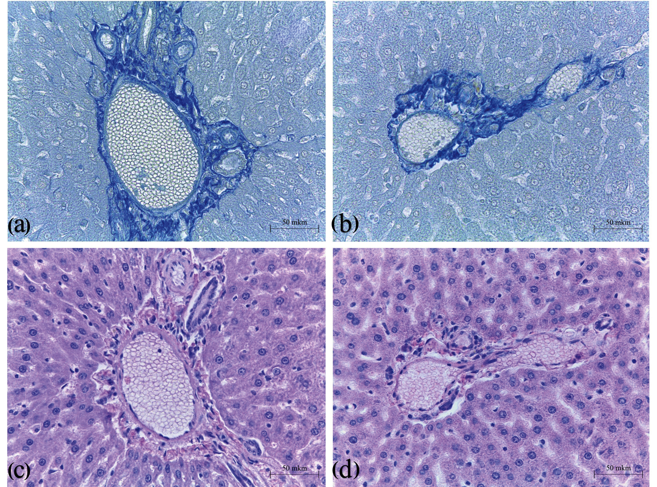 Рис. 2. Структура печеночных триад в препарате печени: (a, c) — в печени крысы линии SHR; (b; d) — в печени крысы породы Wistar. Гистологическое окрашивание препаратов анилиновым синим (a; b), гематоксилином и эозином (с; d). Объектив Plan 40х/0.65.