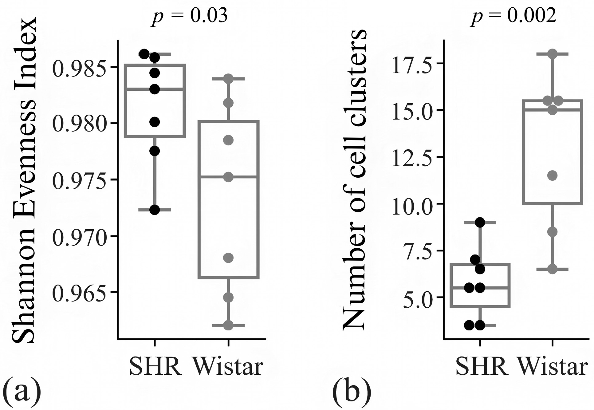 Также была выполнена оценка равномерности распределения иммунопозитивных структур на изображениях c помощью информационного индекса Шеннона и алгоритма DBSCAN. Результаты оценки равномерности по Шеннону показали, что в группе SHR распределение иммунопозитивных структур было значительно более равномерным, в то время как в группе Wistar наблюдалась кластеризация (рис. 4, p = 0.03). Результаты оценки равномерности распределения клеточных структур с помощью алгоритма DBSCAN подтверждали полученные результаты (p < 0.01).