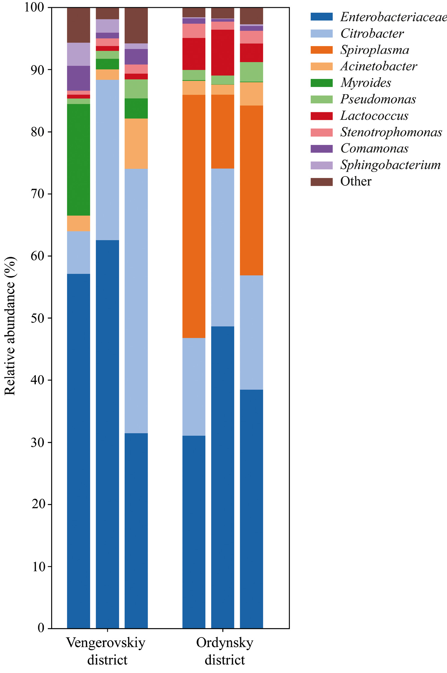 Бактерии рода Acinetobacter, Myroides, Pseudomonas, Lactococcus, Stenotrophomonas, Comamonas и Sphingobacterium присутствовали в кишечнике насекомых обеих групп в меньших пропорциях 1–5% (рис. 1). Однако, стоит обратить внимание, что в кишечнике насекомых Ордынского района также доминирующим таксоном отмечены бактерии рода Spiroplasma и составляют 30.6 ± 7.8%, при этом в Венгеровской группе насекомых данного рода бактерий не обнаружено. Стоит отметить, что в кишечнике насекомых было обнаружено минорное присутствие (меньше 1%) бактерий рода Enterococcus, Providencia, Empedobacter, Serratia, Vagococcus, Achromobacter, Delftia, Flavobacterium, Acidovorax, Alcaligenes, Melaminivora, Sphingomonas, Diaphorobacter, Pseudarthrobacter, Brevundimonas.