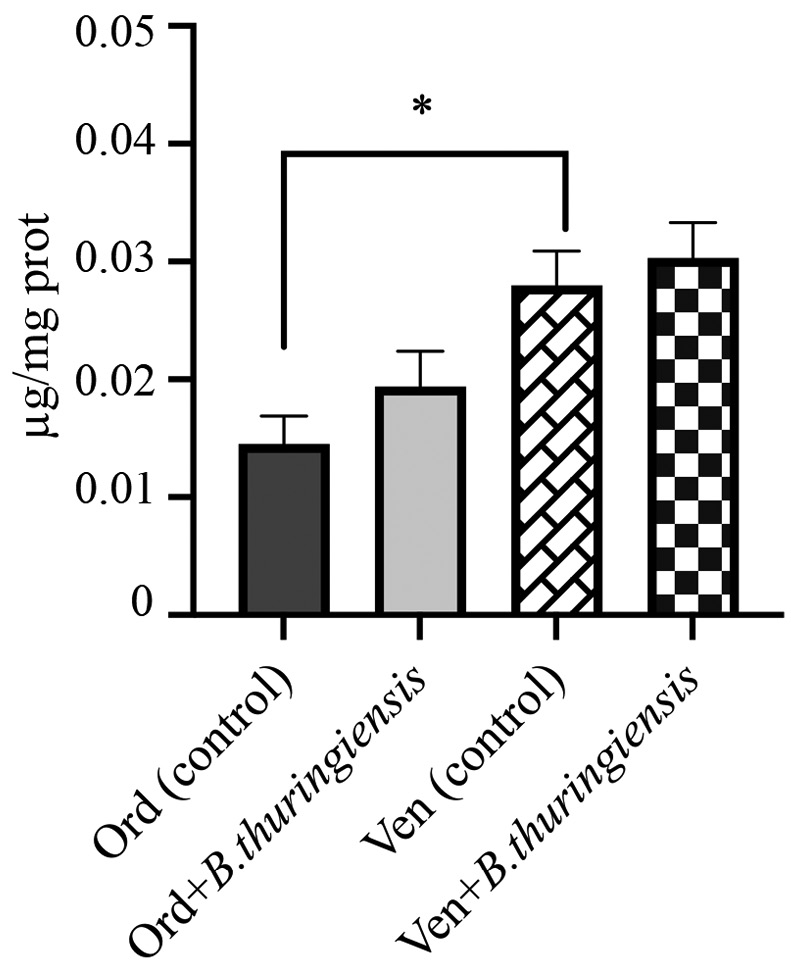 Рис. 4. Лизоцим-подобная антибактериальная активность в плазме гемолимфы личинок колорадского жука из двух географических точек Новосибирской области (Ордынский район (Орд) и Венгеровский район (Вен)) через 48 ч после перорального заражения споро-кристаллической смесью бактерий B. thuringiensis ssp. morrisoni (Орд+B. thuringiensis; Вен+B.thuringiensis). Данные представляют собой среднее арифметическое значение и его ошибку. Достоверность различий определяли с помощью однофакторного дисперсионного анализа тестом Тьюки. *– p < 0.05 - по сравнению с незараженными насекомыми Ордынского района (Орд контроль).