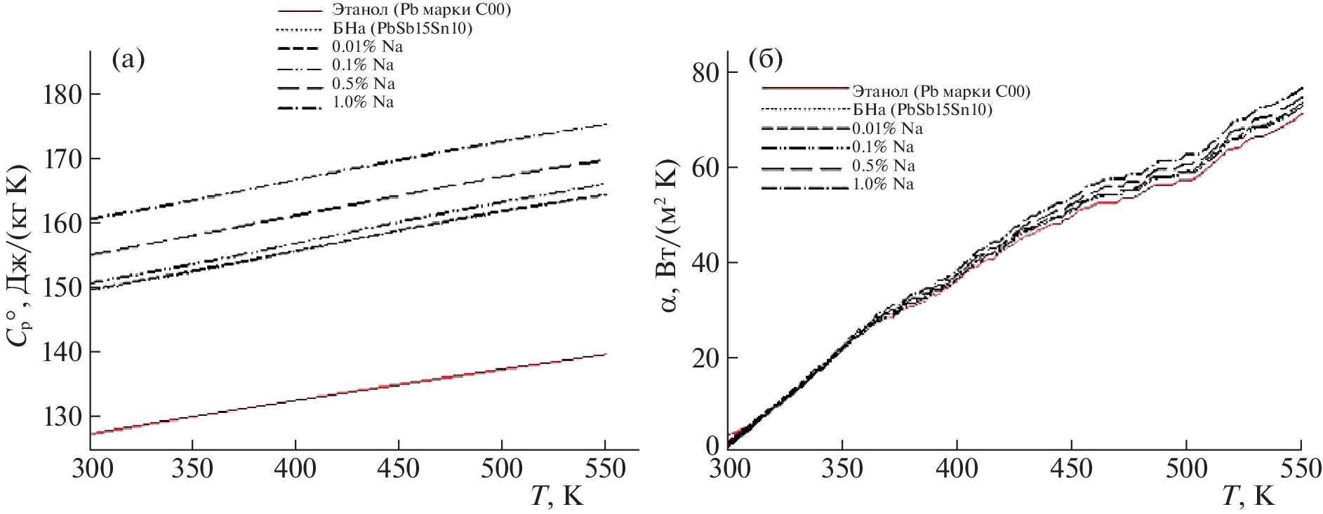 The heat capacity of sodium-alloyed lead babbitt BNa (PbSb15Sn10Na) is determined experimentally, and the temperature dependences of the changes in the thermodynamic functions of this alloy are calculated. The temperature dependence of the heat capacity of babbitt BNa is studied in the cooling mode using the SigmaPlot 10.0 software. Polynomials are determined for the temperature dependences of the heat capacity and the changes in the thermodynamic functions (enthalpy, entropy, and Gibbs free energy) of babbitt BNa and a reference sample (S00-grade Pb), that describe these dependences with coefficient of correlation Rcorr = 0.999. It is shown that the heat capacity of babbitt BNa grows along with the content of sodium, its enthalpy and entropy grow along with temperature and the content of sodium, and its Gibbs energy falls.