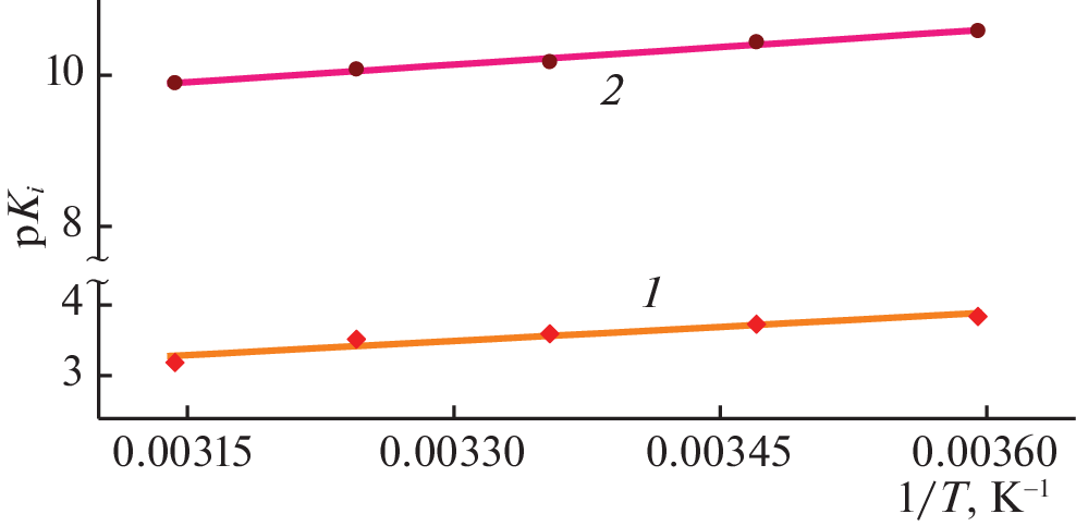 The acid–base properties of β-alanine (β-Ala) in aqueous solution were studied by the pH-metric method in the temperature range 278.2–318.2 K and at I = 0.1 M KCl. The ionization constants (pKi) of β‑Ala at different temperatures were calculated. The ionization constants were found to change depending on the temperature: an increase in the temperature leads to a decrease in pKi for both carboxyl and amine groups, which indicates that the degree of ionization of β-alanine increased and its acidic properties were enhanced. The thermodynamic characteristics (ΔН0, ΔS0, and ΔG) of the corresponding ionization processes were determined by the temperature coefficient method.