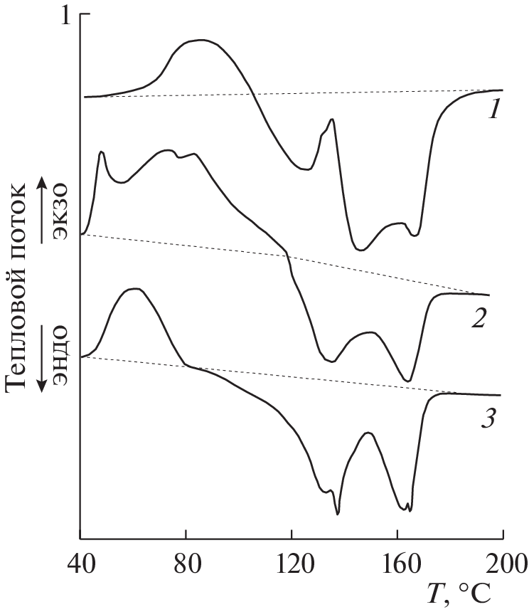 Смеси полипропилена (10 мас. %) с антраценом, фталоцианином, индиго, адамантаном, конго красным, спиропираном, сафранином, метилоранжем, бромкрезоловым пурпурным, фенолфталеином, флуоресцеином, феноловый красным, тимоловый синим, аспарагиновой кислотой, циануровой кислотой, тимолфталеином, родамином подвергали пластическому деформированию под давлением 1 ГПа на аппарате высокого давления типа наковален. Методом ДСК установлено, что на термограммах нагревания деформированных смесей в температурном диапазоне ниже Тпл полимера присутствуют эндотермические пики плавления мелких полимерных кристаллитов с энтальпиями, достигавшими в некоторых образцах 220–240 Дж г–1, а также экзотермические пики холодной кристаллизации с энтальпиями достигавшими 430–470 Дж г–1. Процесс плавления в некоторых смесях описывался би- и тримодальными пиками, суммарная энтальпия которых в некоторых смесях достигала 2200–2400 Дж г–1. Процесс кристаллизации полимера в деформированных смесях описывался одиночными экзотермическими пиками, энтальпии которых мало отличались от энтальпии кристаллизации исходного полипропилена. Увеличение энтальпий тепловых процессов в деформированных смесях связывали с возникновением на границах раздела разнородных фаз двойных электрических слоев.