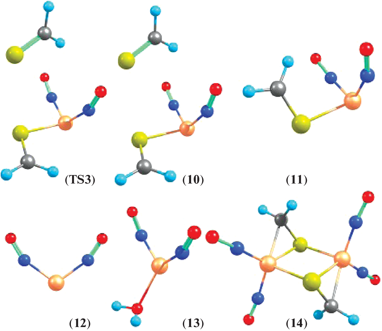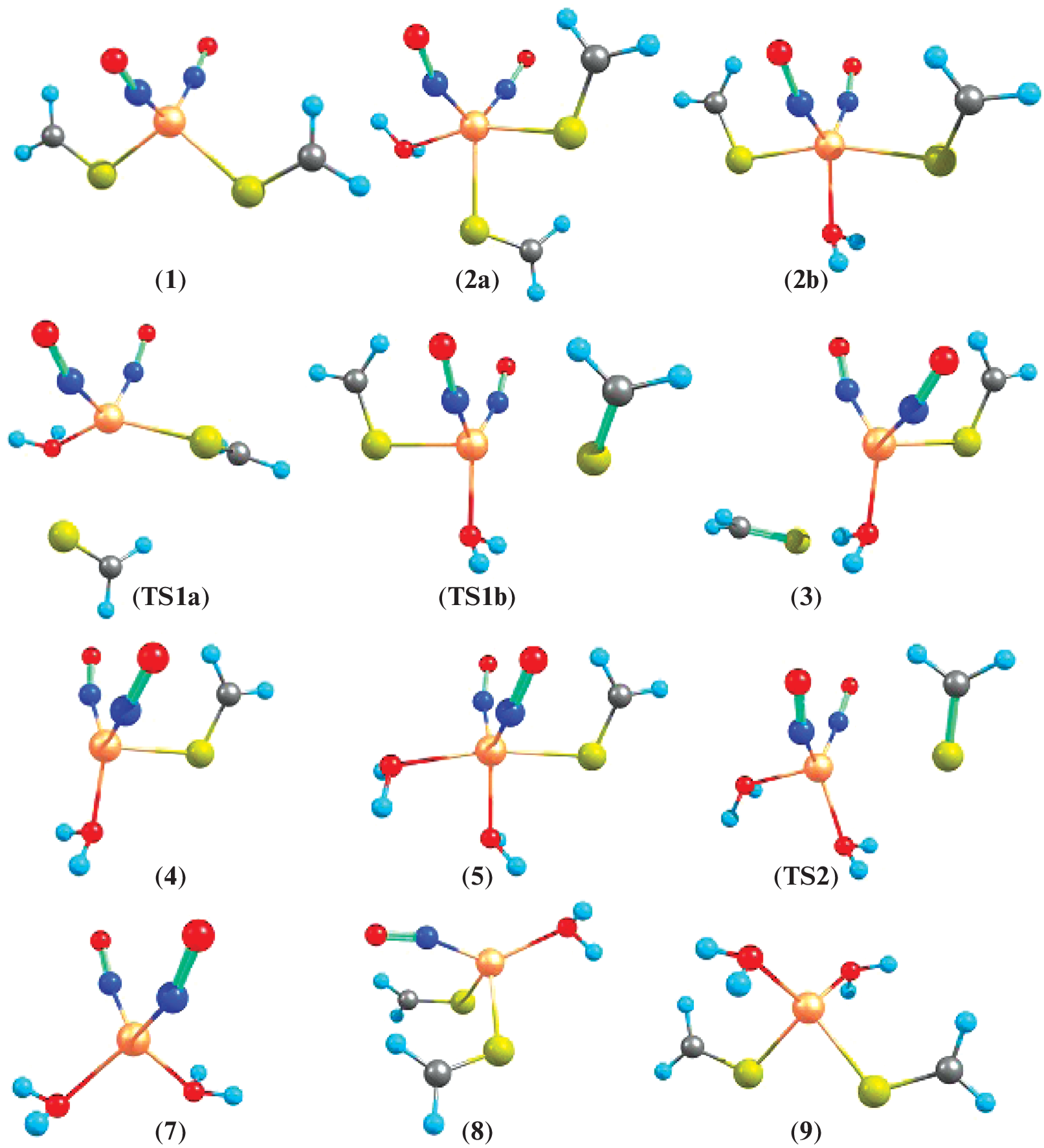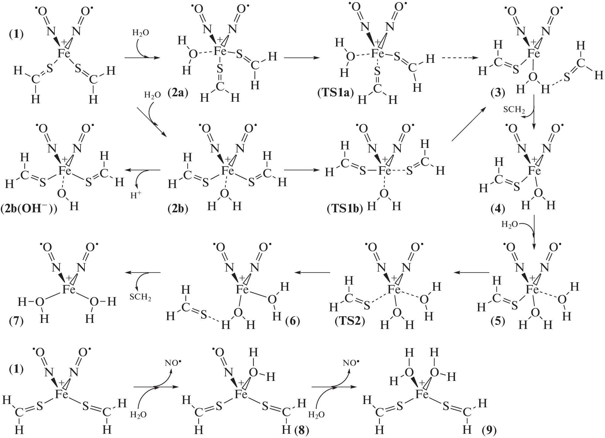 The mechanisms of hydrolysis of a model iron–sulfur–nitrosyl complex (ISNC) [Fe(NO)2(SCH2)2]+ 1 with thioformaldehyde ligands have been studied using the density functional theory and polarizable continuum model of water. Quantum chemical calculations employed the TPSSH and M06 functionals and def2-TZVP basis set and took into account interactions with water medium. Hydrolysis of 1 was found to be an exothermic process with small activation energy whereas exchange of NO for H2O is thermodynamically unfavorable. The calculations have predicted lower activation barrier for the associative mechanism with concerted replacement of SCH2 by H2O than for dissociative mechanism with homolytic bond cleavage of the Fe–S coordination bond in water. The mechanism of hydrolysis that involves participation of OH– was found to be less probable at pH 7. The calculation results show that ISNC 1 is of {Fe1+(NO•)2}9 type and retains its tetrahedral structure that is typical for crystals of ISNC with thiocarbonyl ligands.
