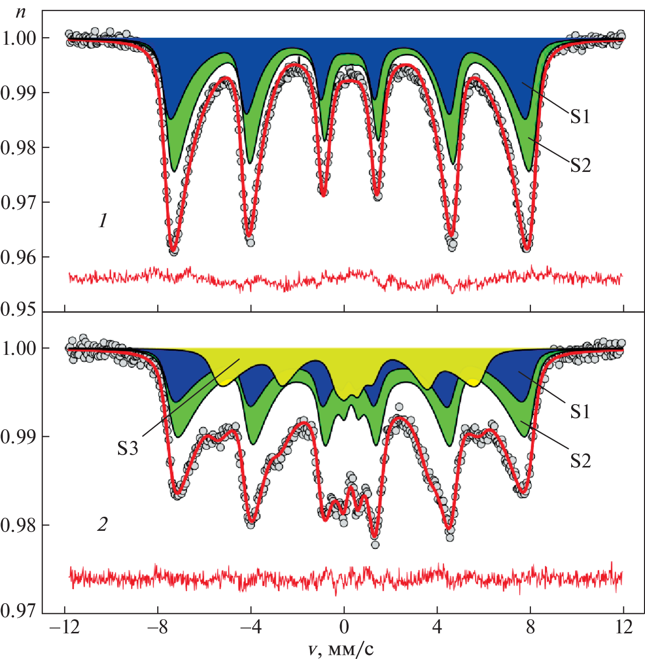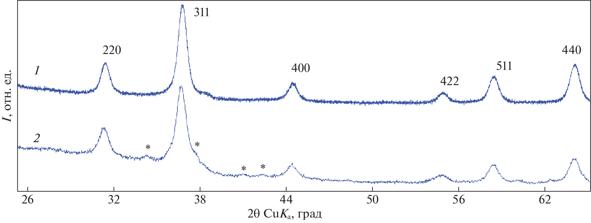 Методом химического осаждения были синтезированы нанопорошки оксидов железа. Показано, что в результате синтеза образуется, в зависимости от условий ультразвуковой обработки, фаза оксида железа со структурой магнетита (твердый раствор магнетита-маггемита, либо смесь этого твердого раствора и гетита). Размер ОКР и размер частиц для основной фазы соответствует ~10–20 нм. Синтезированные порошки оксидов железа обладают развитой поверхностью и имеют значения удельной площади поверхности SBET ≈ 92 и 117 м2/г, а также одинаковый, достаточно большой, удельный объем пор (\({{V}_{P}}{{_{{/{{P}_{0}} \to 0.99}}}_{{}}}\) = 0.35 см3/г). Показано, что дополнительное ультразвуковое воздействие in situ на находящиеся в маточном растворе магнитные наночастицы оксидов железа приводит к резкому окислению ионов железа (II) и появлению немагнитной примесной фазы гетита.